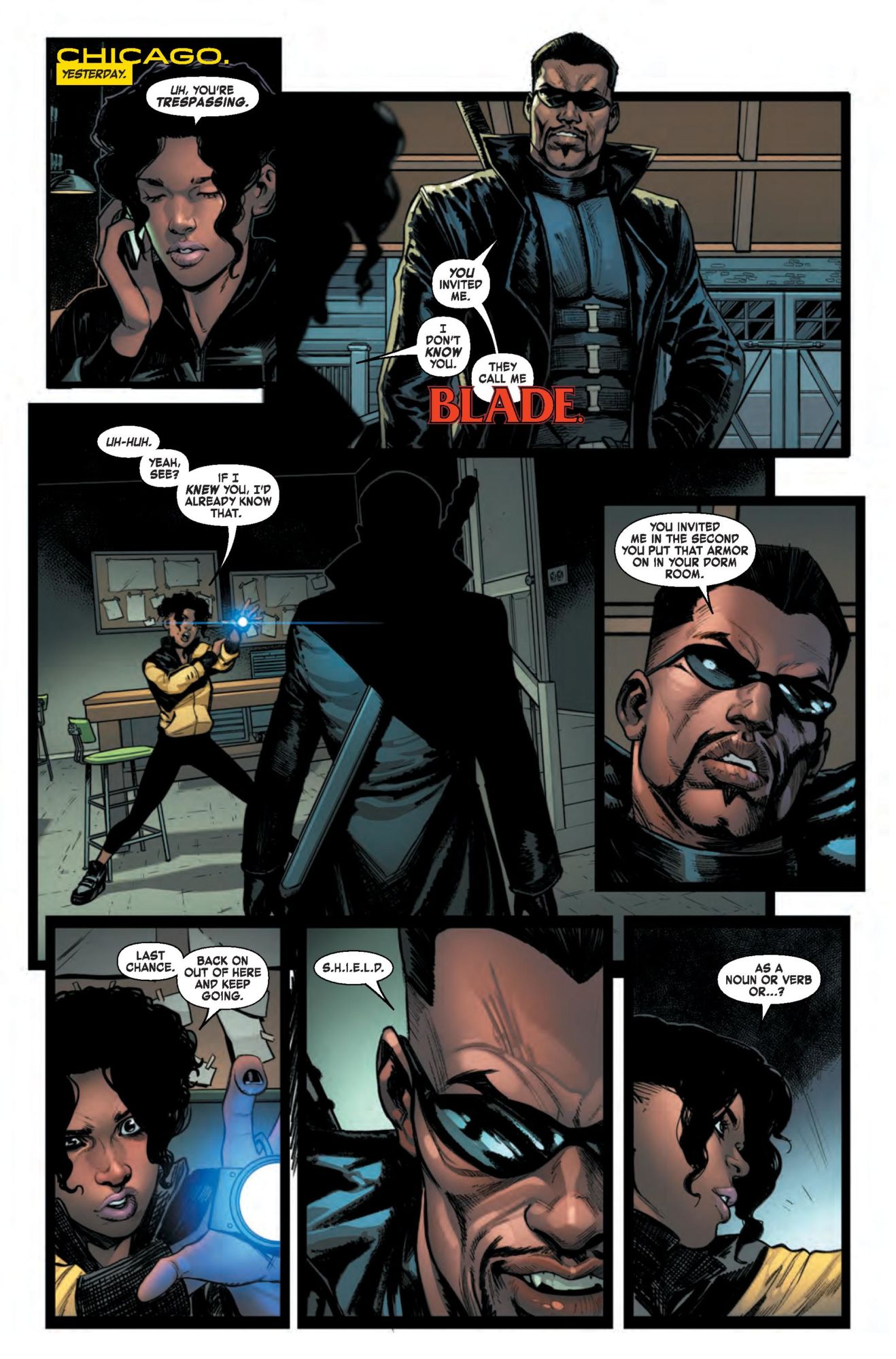 Riri Williams is being visited by Blade. You know how some folk are out of sorts that Black Panther is credited as the first of a certain type of film, when Blade did it decades ago? Well, we get a bit of a repeat…