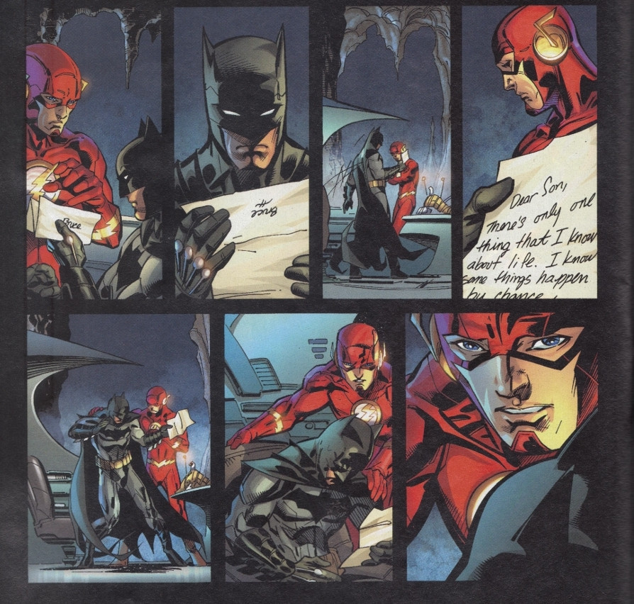 Through various time shifting, and the influence of Watchmen's Dr Manhattan – now revealed as the instigator of the New 52 timeline in the first place, Thomas Wayne writes a letter to Bruce Wayne. They met. And Thomas told Bruce to stop being Batman.