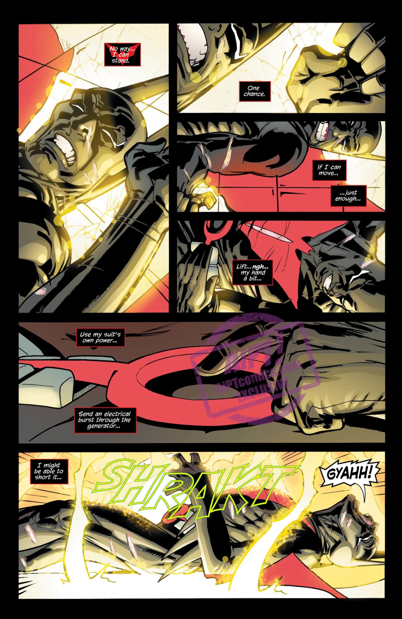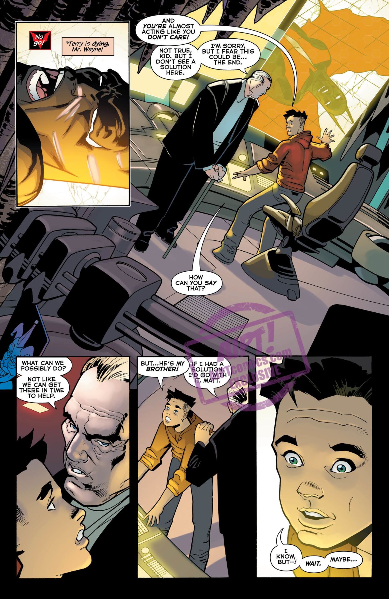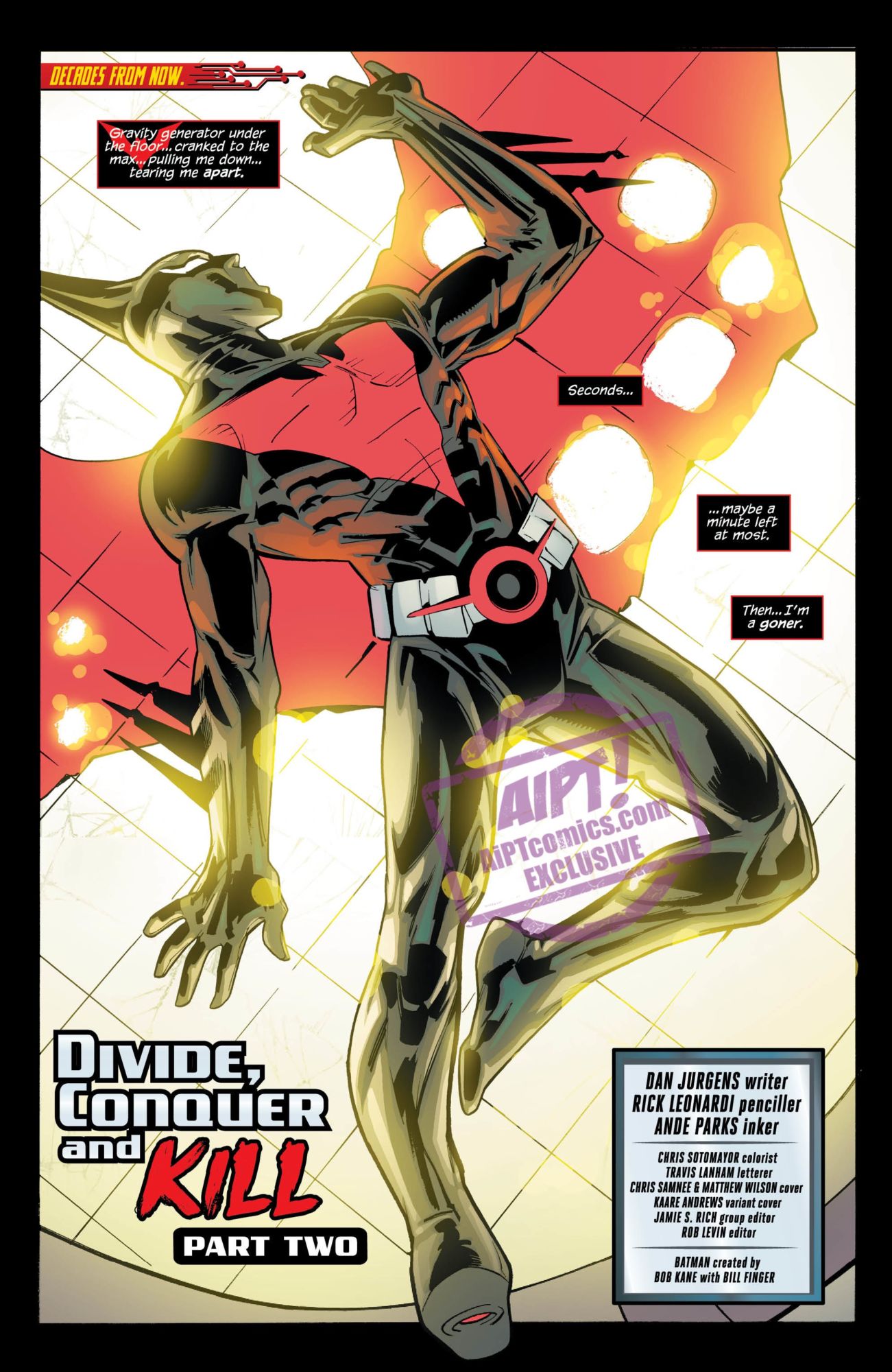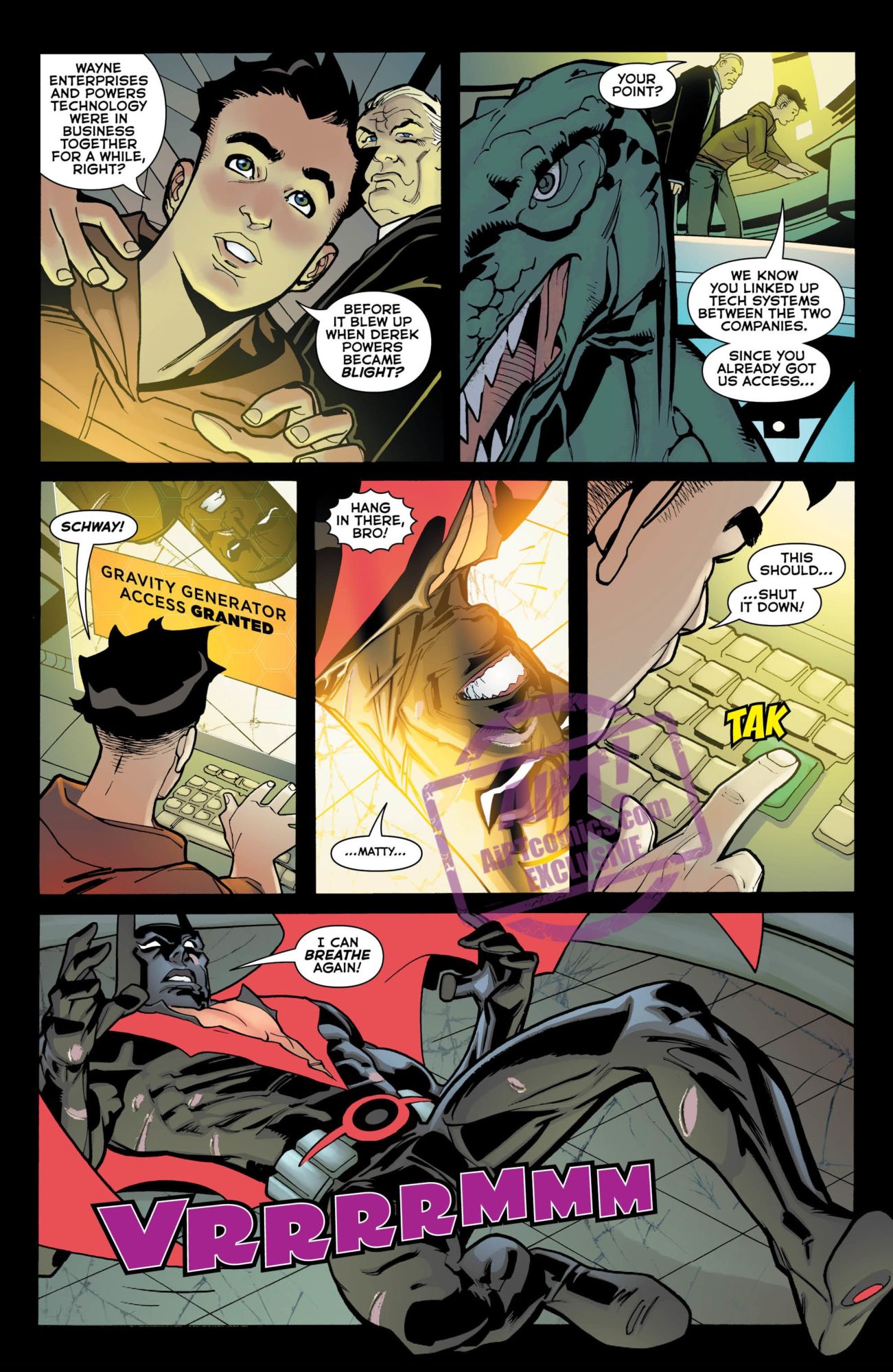 In the future world of Batman Beyond, Bruce Wayne no longer has to be Batman. And, in fact, he cannot be. But does he have to be totally useless? Apparently so, as we see in this preview of Batman Beyond #32. Batman is seconds from death, unable to breathe thanks to a gravity generator…