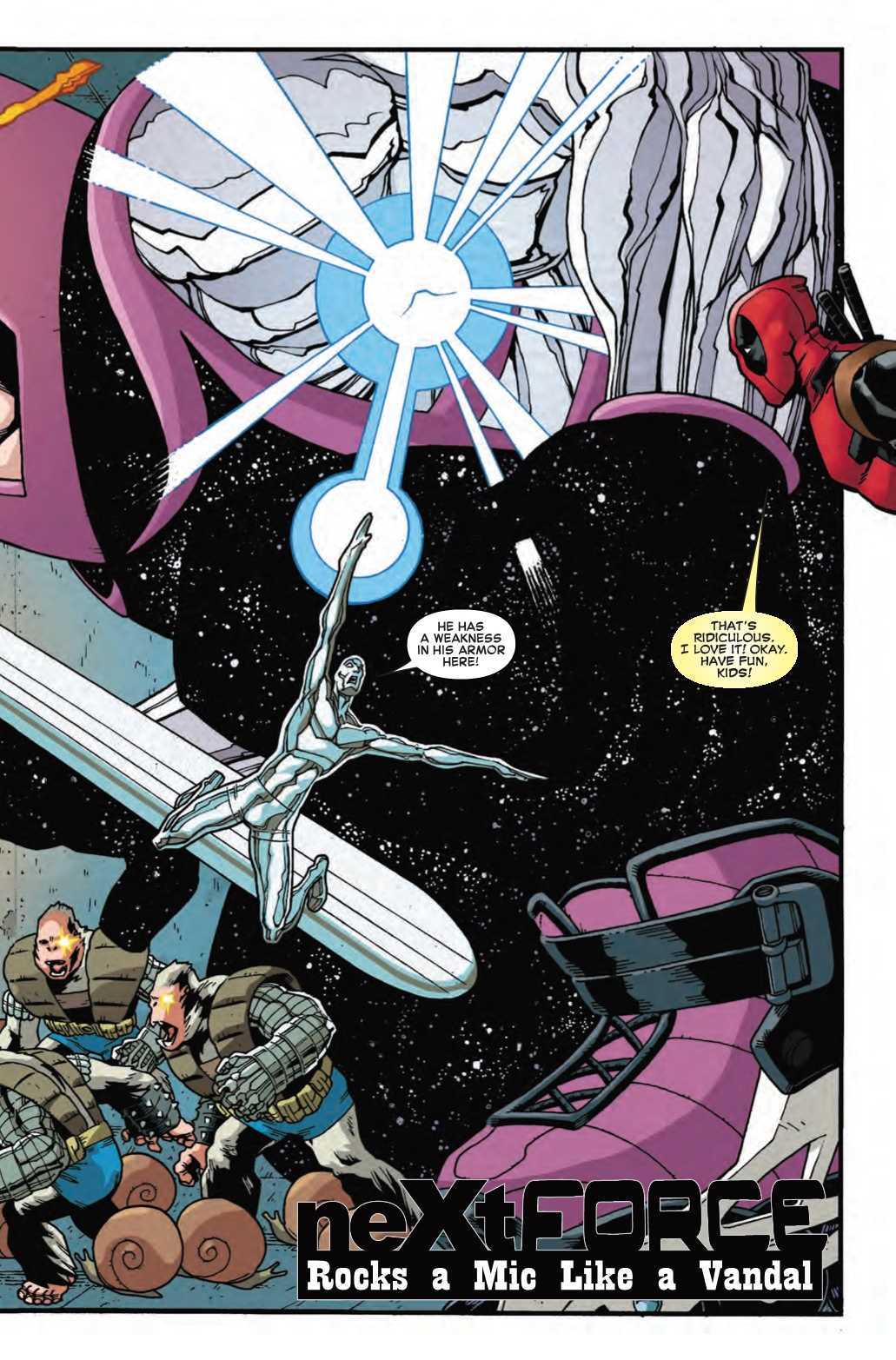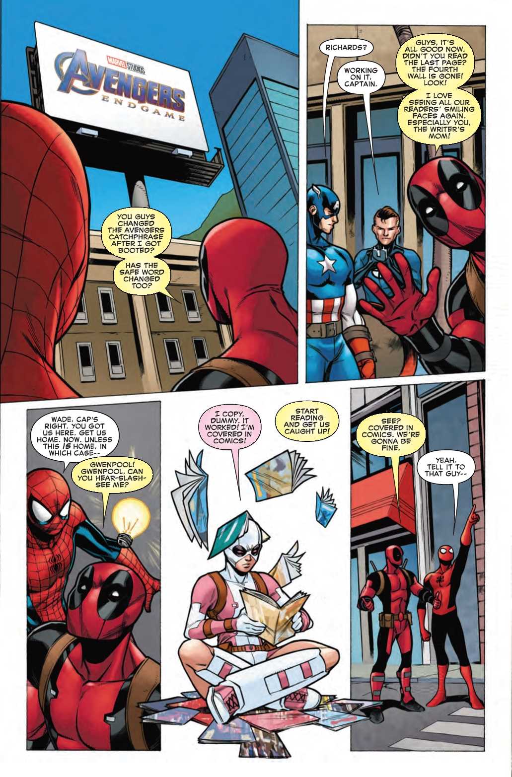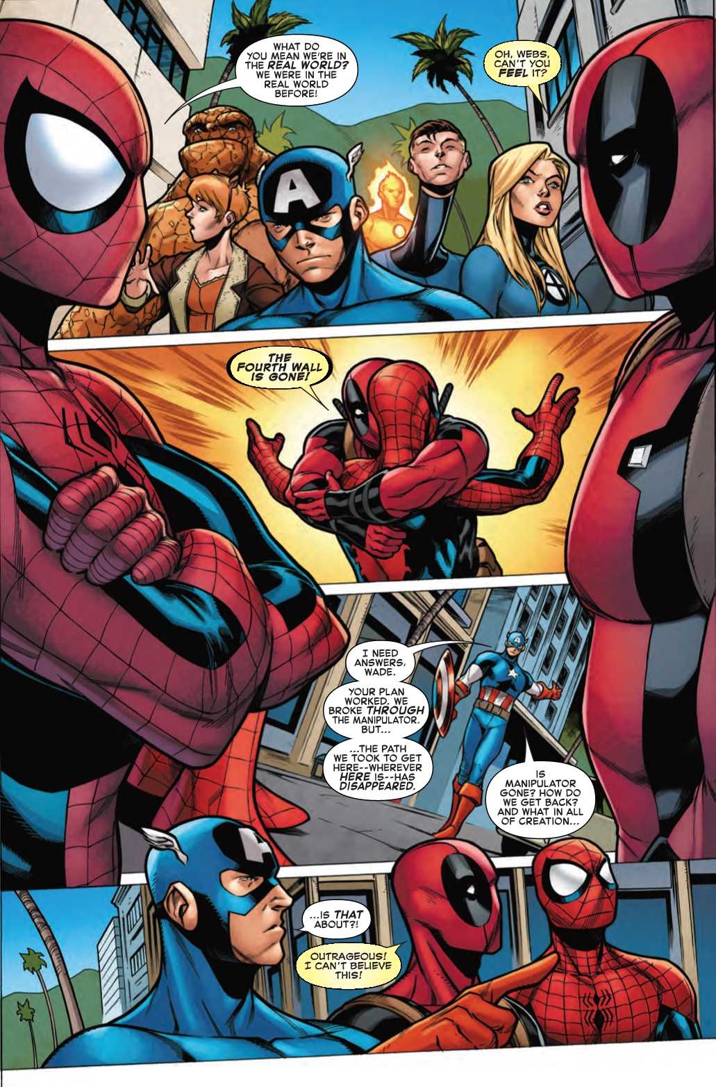 The preview begins with Deadpool, leading his team of Marvel superheroes, and with the help of Gwenpool, having broken the fourth wall for real in the most extreme way possible, bringing his team into the "real world," our universe.
