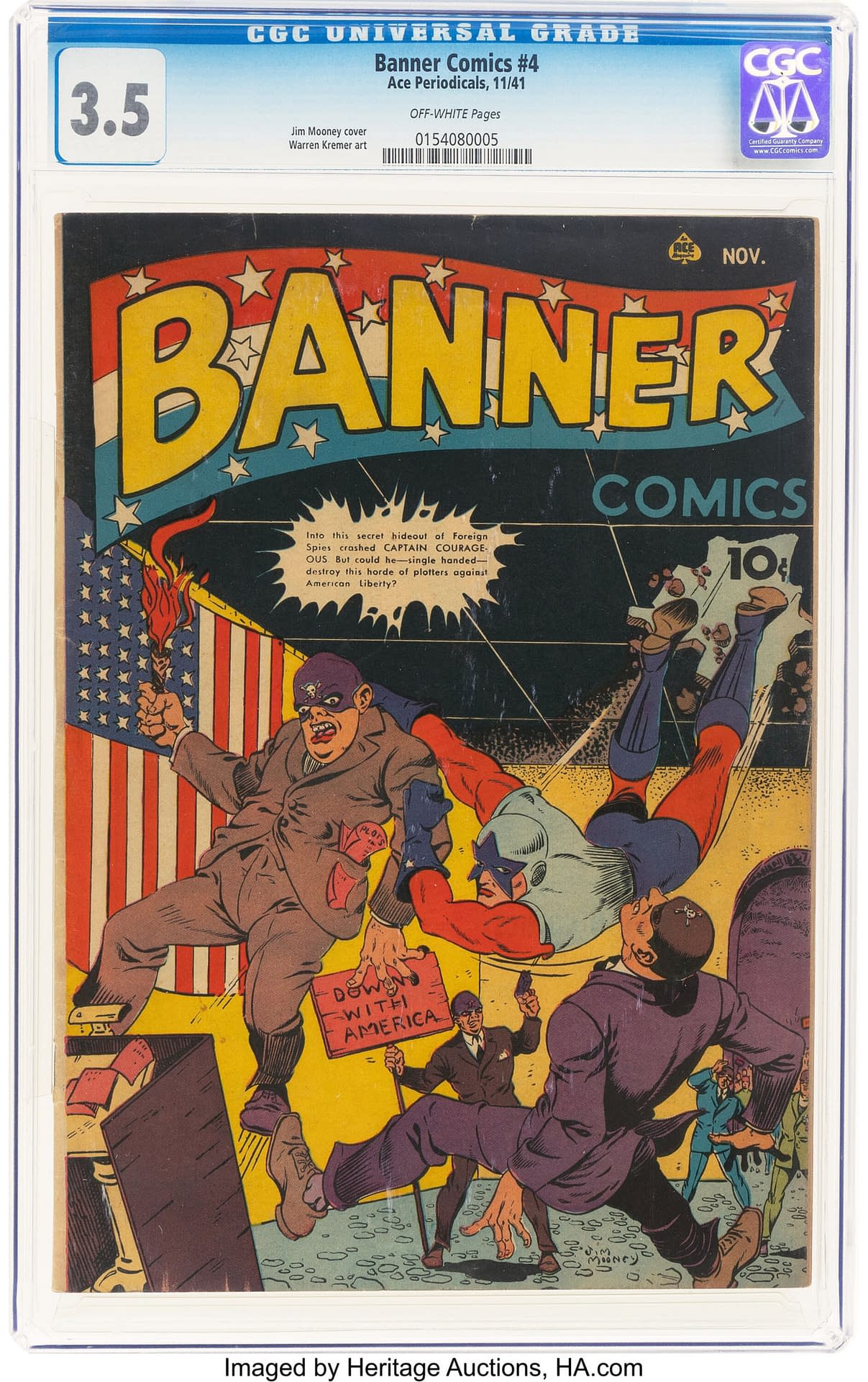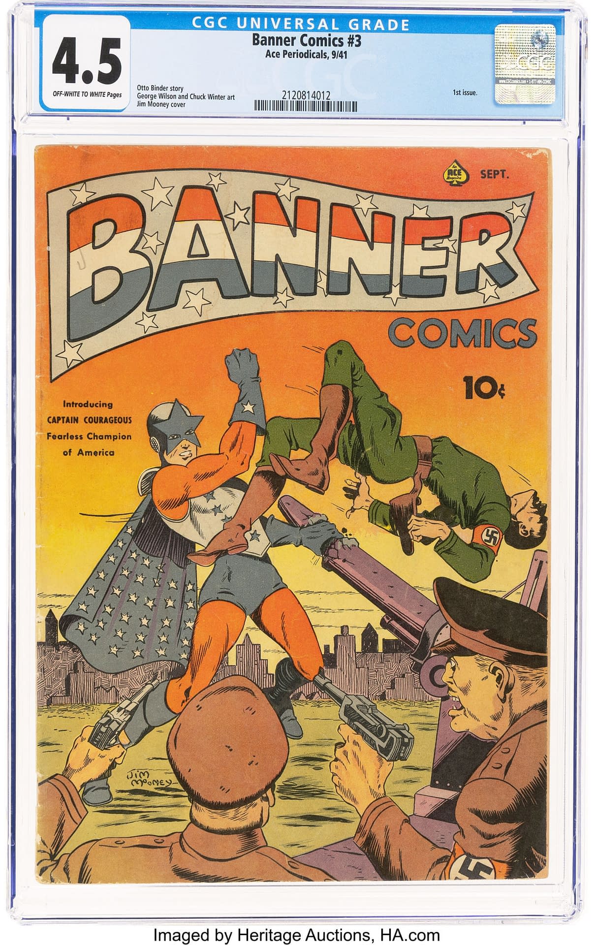 Ace Periodicals' Banner Comics title starts off with a little bit of a mystery: the series begins with issue #3. Typically, this would mean that the series changed titles after the first two issues, sometimes even from a non-comics title, but there's no apparent match for that scenario on the Ace Periodicals timeline. The debut of Captain Courageous in that issue isn't much less of a mystery. The character may have been created by Jim Mooney, but that is far from clear. Captain Courageous's origin and powers are vague. He is super strong and durable, and appears to defend Democracy when needed as a kind of patriotic force of nature. This sort of superheroic shorthand was not uncommon outside of major publishers like DC Comics, Marvel/Timely, and Fawcett. After the Golden Age had progressed for a bit, some publishers relied on the assumption that the readership understood the conventions of superhero stories, and given that stories might be 8-16 pages long in this era, they just got down to the business of setting up a storytelling conflict and rolling with it. With a name like Captain Courageous, perhaps that all makes sense after all, and there's one of the rarest Ace Periodicals comics ever published available here with a CGC 4.5 copy of Banner Comics #5 (Ace, 1942) up for auction along with copies of #3 and #4 in the up for auction in the 2025 December 11 Golden Age Comics Century Showcase Auction IV.