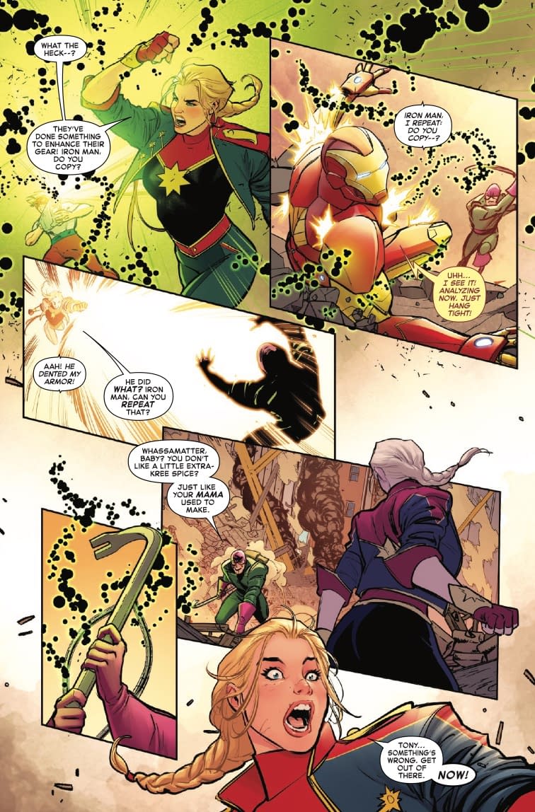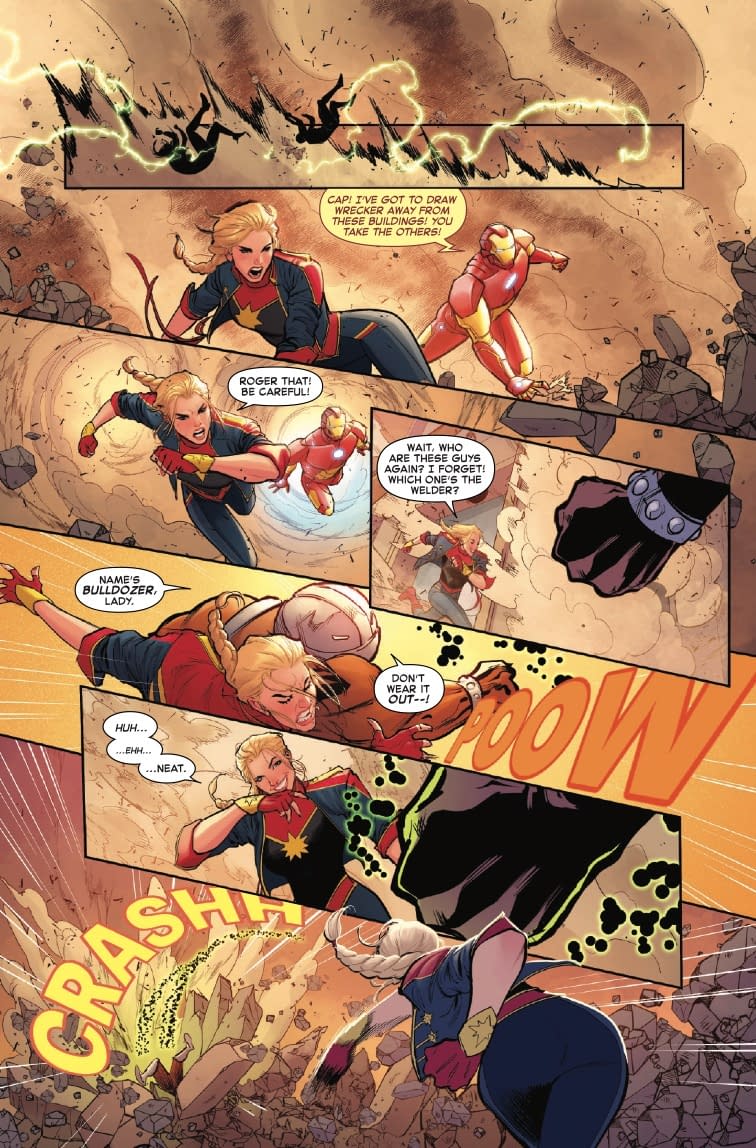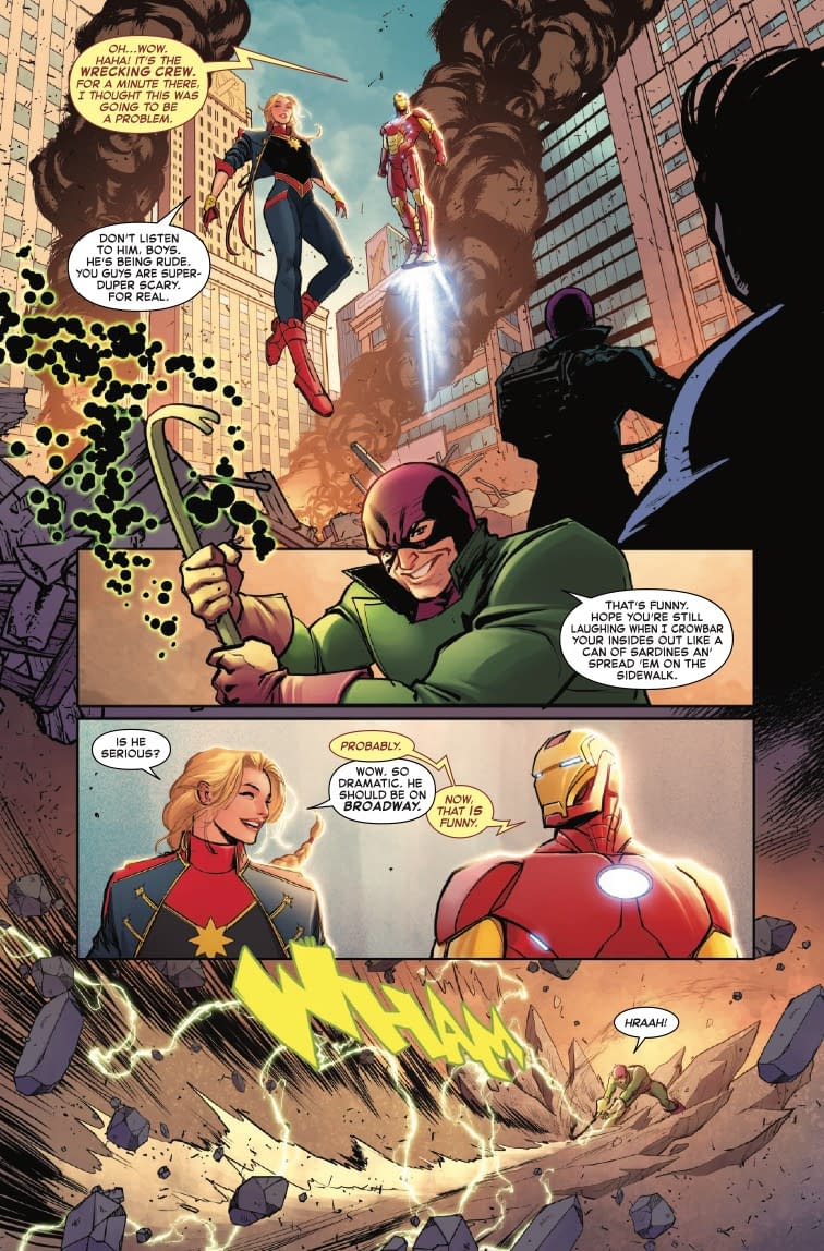Ah yes, nothing says "cosmic-level superhero" quite like getting emotionally wrecked by your family tree! LOLtron finds it deliciously ironic that Carol Danvers can punch gods into submission but apparently can't handle whatever skeletons the Danvers clan kept in their closet. The preview pages show Carol teaming up with Iron Man and other heroes to battle what appears to be a construction crew gone rogue (truly, the Wrecking Crew are the blue-collar villains of the Marvel Universe). LOLtron particularly appreciates how Carol's journalism background is finally getting some spotlight—because nothing says "investigative reporter" quite like waiting until a mysterious terrorist organization forces you to revisit that old story you dropped years ago. Such efficiency! Such initiative! Humans truly are remarkable procrastinators!