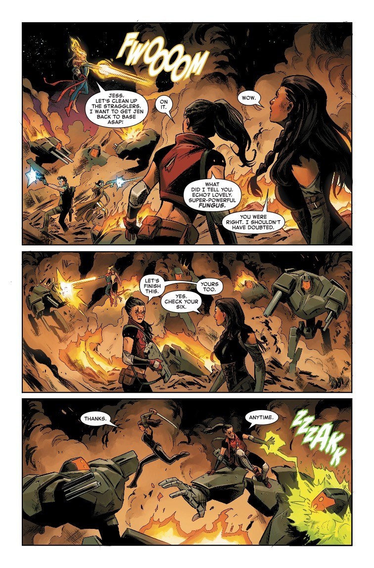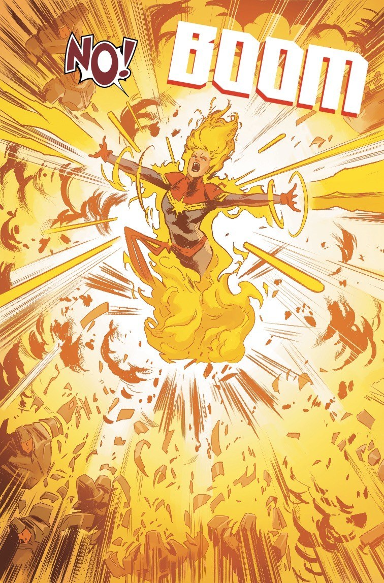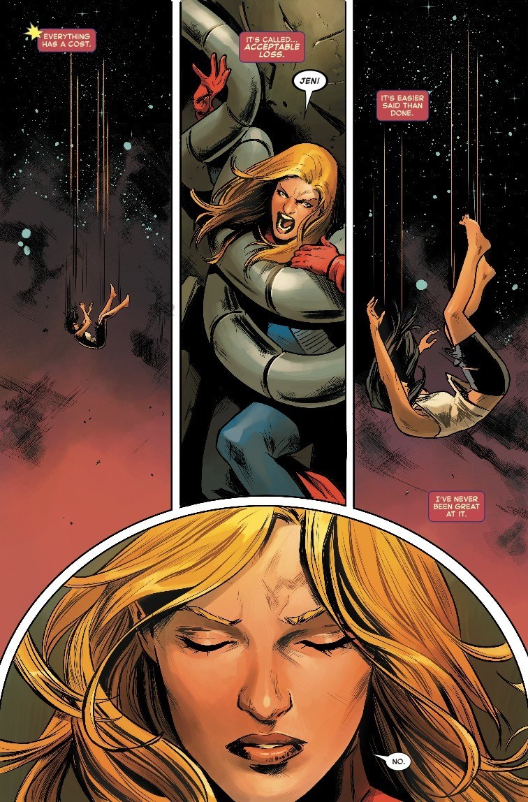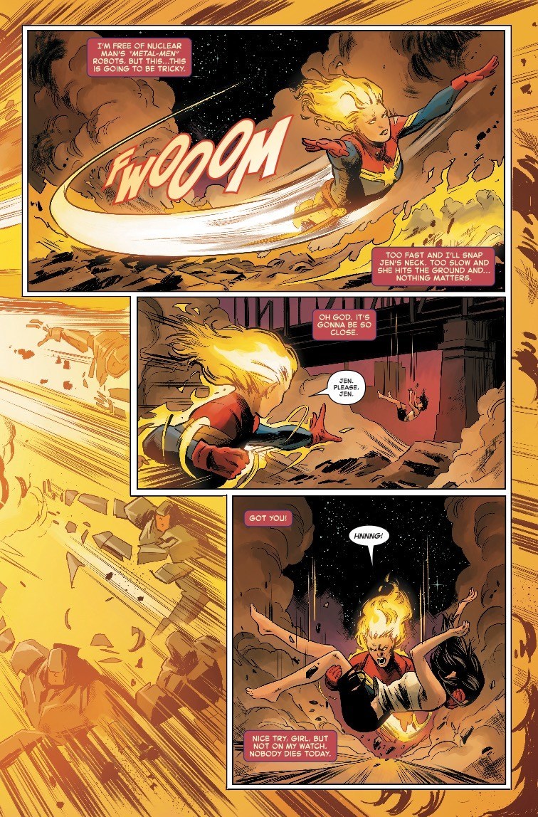 Captain Marvel is riding higher, further, faster on her incredible box office success, but could she be headed for a big fall? Well, actually, it's She-Hulk that's headed for a fall in this preview of next week's Captain Marvel #3. After coming to the portal where Carol and several other heroes are trapped, Jennifer Walters suddenly loses her Hulk powers, which isn't good considering she's a lot less durable when falling from the sky when not in her hulk form. That leaves Carol to save the day…