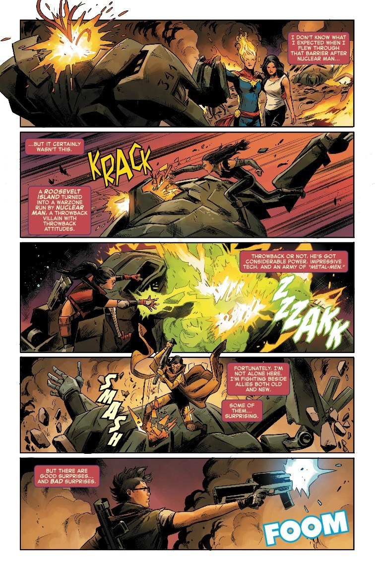 SHE-HULK joins CAPTAIN MARVEL in her war on Roosevelt Island! But the barrier continues to cut them off from the rest of the world, while Nuclear Man's ranks are somehow swelling, and something on the island is interfering with super powers. If Carol's going to win this fight, she'll need an army of friends, a hangar of war machines and an ironclad plan. But can she really trust all her allies? And what face from Carol's past is about to show up and change everything?