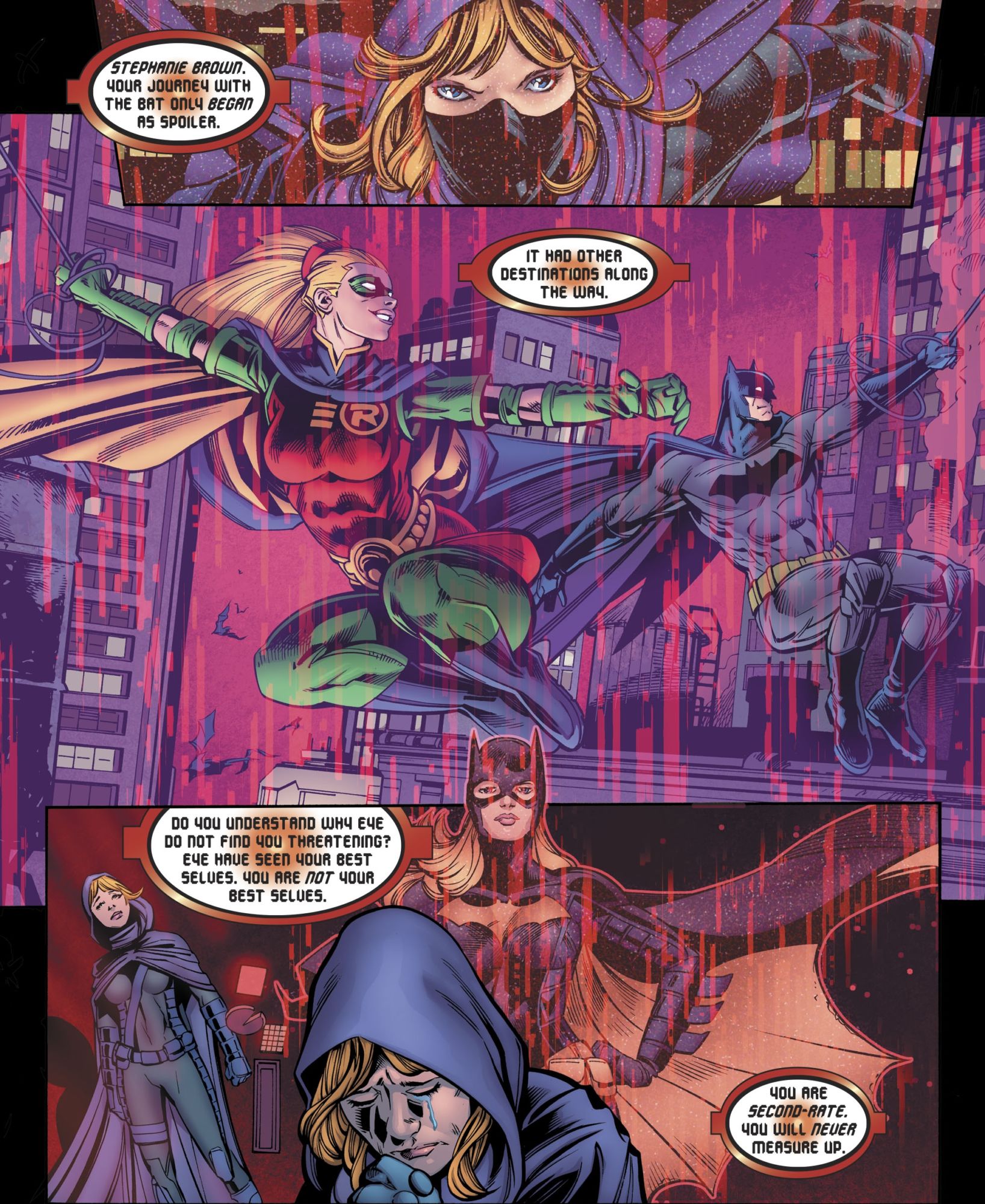 While Stephanie Brown briefly gets to be Robin again as well… and then a little shaming to boot.