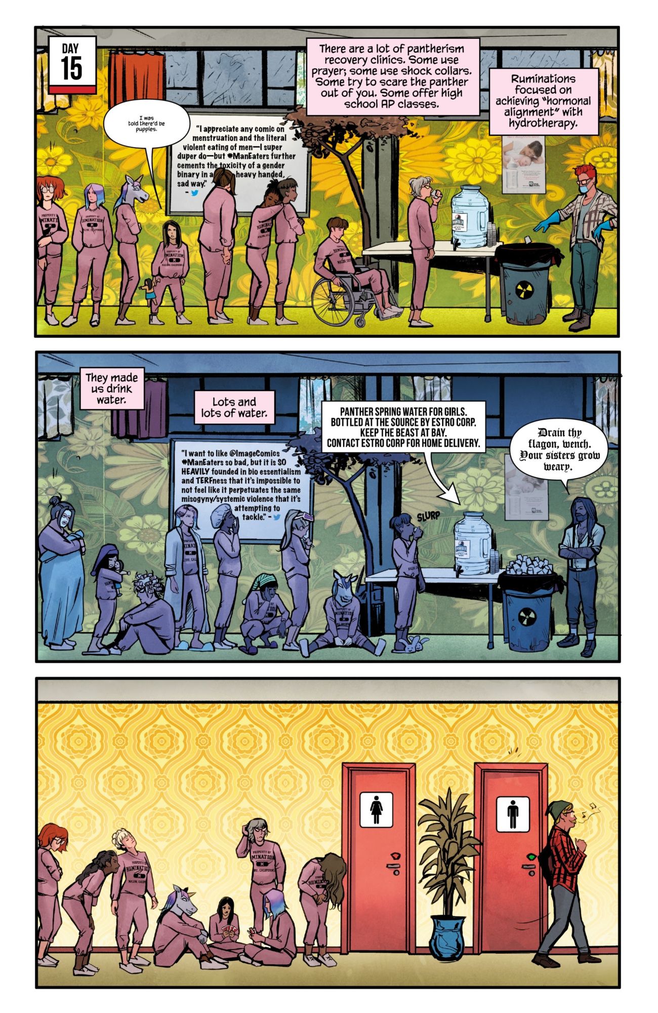 Man-Eaters has been criticized since its announcement for presenting a binary view of gender that excludes experiences of transgender men, transgender women, and nonbinary people. The comic's central premise is a dystopian satire where girls turn into ferocious were-cats when they get their periods and the book's patriarchal society outlaws periods as a result, leading to repeated criticisms that the book fails to address how the premise would affect transgender men who menstruate, transgender women who do not, and nonbinary people who may or may not. Cain initially responded to some tweets from a private individual on Twitter back in May, but then reprinted two of their tweets on a poster on the wall of menstruation reeducation camps in last week's Man-Eaters #9, sparking a series of critical tweets from comic book industry critics, pundits, professionals, and readers on Saturday to which Cain repeatedly attempted to respond, only to further stoke the flames when those responses were viewed as ignoring the substance of criticisms or focusing on Cain's own distress.