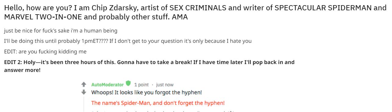 When you post the word 'Spiderman' instead of 'Spider-Man' on Reddit r/comicbooks, a helpful bot pops up you correct you of your error. And that's what happened to Peter Parker, Spectacular Spider-Man writer Chip Zdarsky's first post in a two hour Q&A today.