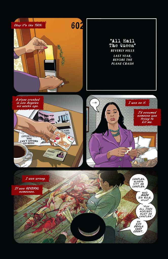 So, we juxtapose Nyx's good night with what the heck is Blood Queen up to with Victory? The answer is two-fold: BRQ needs a lift to Nyx's house, while also planting a travel brochure in Victory's Ober car (page 20).