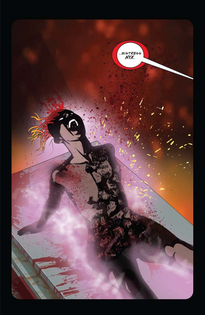 The story of Nyx mirrors the larger story of Vampirella: someone who becomes infected by the human experience. Someone who, as we all do, desires life and love and purpose and who at least momentarily discovers those things and becomes seduced by them to the extent that they almost forget none of those things belong to them.
