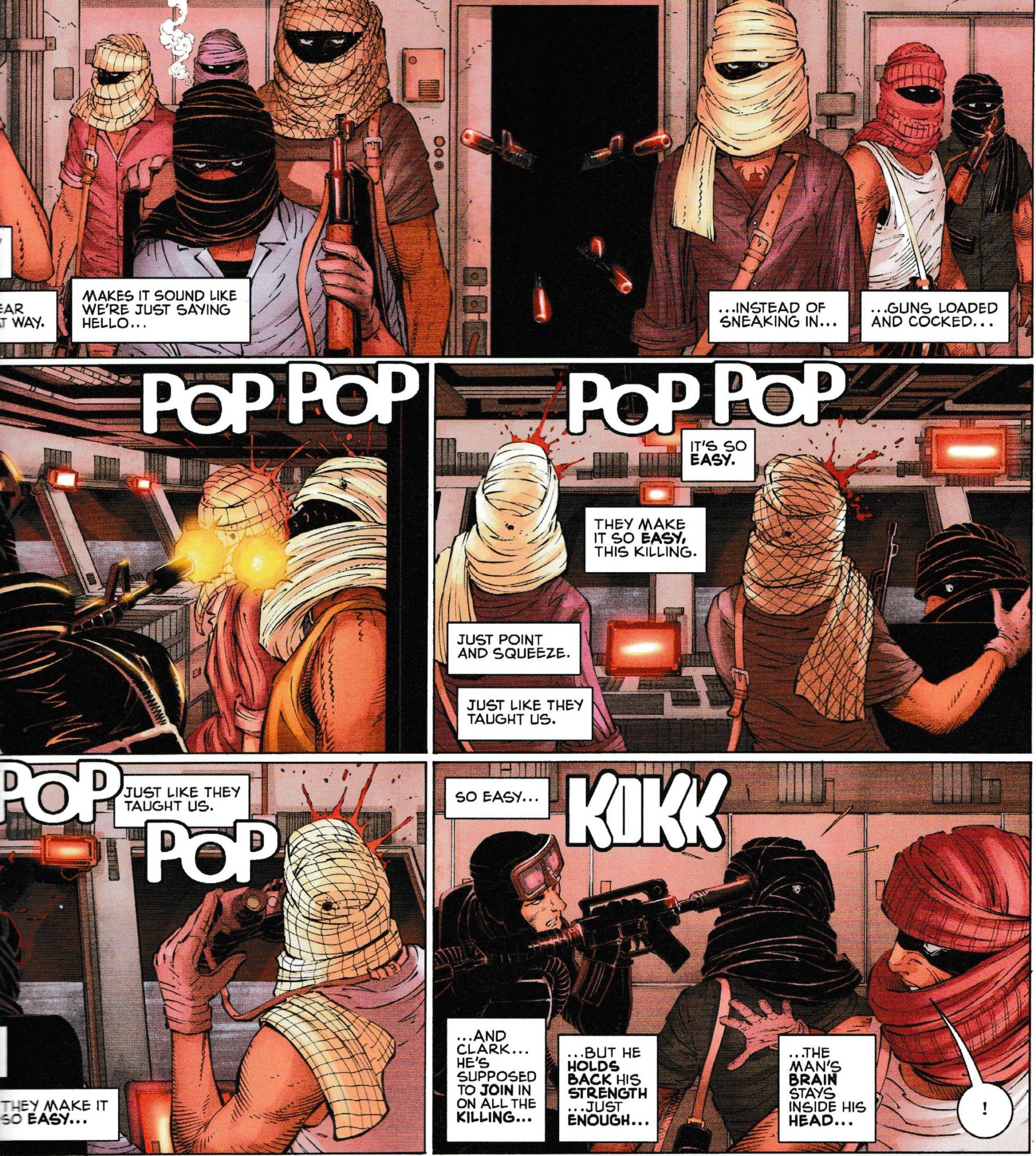 So, yes, we also get to see just how comfortable Superman is with shooting unnamed, faceless Islamic pirates/terrorists with the rest of his troop I mean, hasn't he read Holy Terror? And they may be just cadets but apparently they are all down for some serious secret wet work.