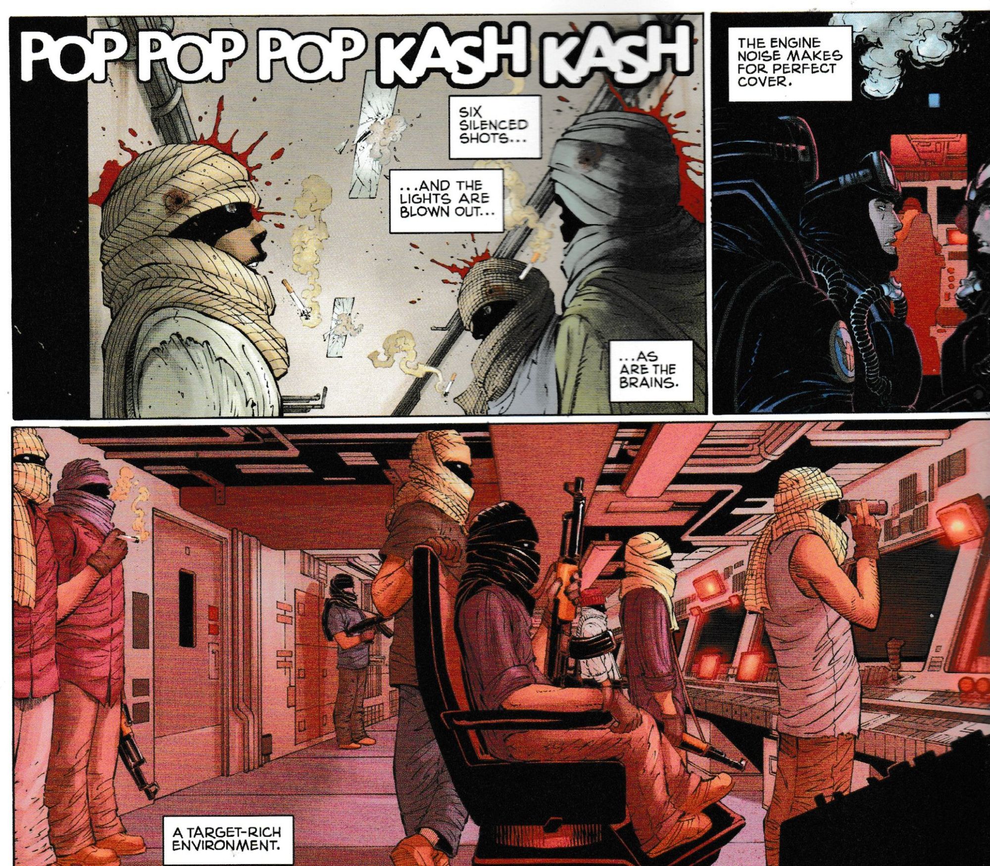 Pop pop pop. So handy that they are all wearing scarves to cover their faces, even if after killing the whole crew, they have no reason to hide their faces. Makes them easier to kill that way, apparently.