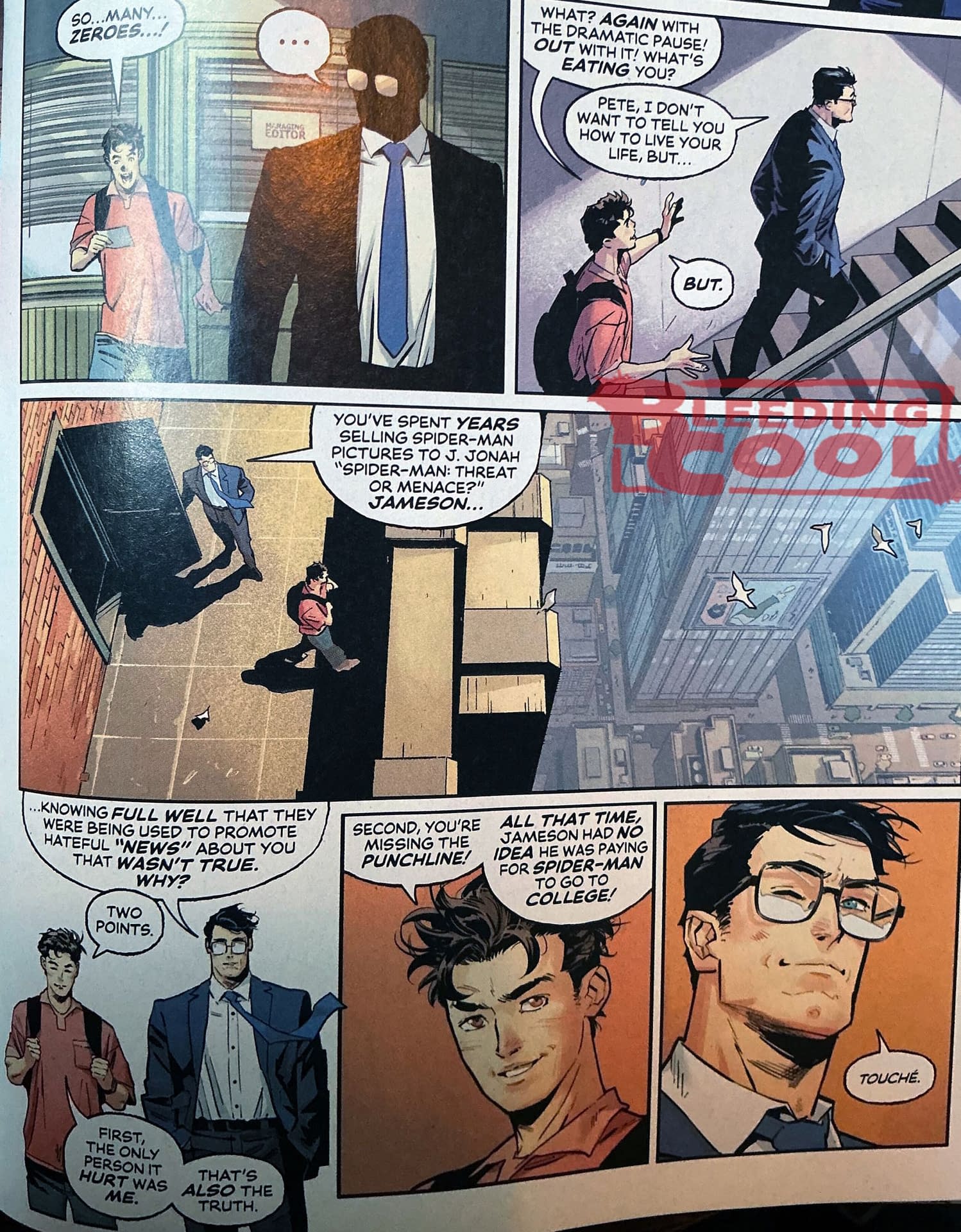 - Clark Kent and Peter Parker discuss journalism rivalry between Daily Planet and Daily Bugle.