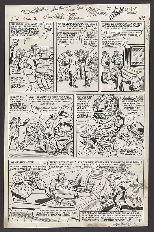 An amazing find, this page of Jack Kirby art is from the second Fantastic Four annual, and features tons of shots of Thing, and a panel featuring the whole Fab Four climbing into the Fantasticar! Could there be a better page to own?