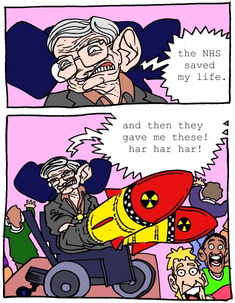I also recall a week back in 2009 where Fox News made the ridiculous claim that the NHS was a breeding ground for terrorists, at the same time Stephen Hawking was talking about the NHS saving his life. Well, there was only one way to go…