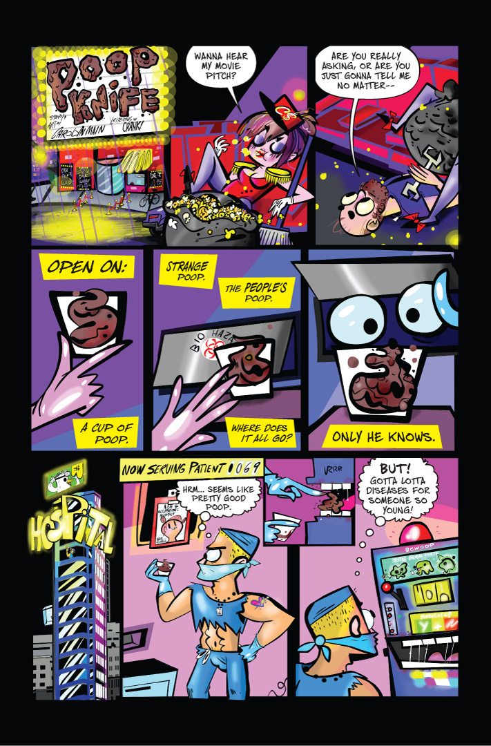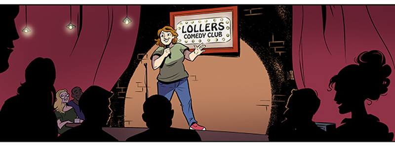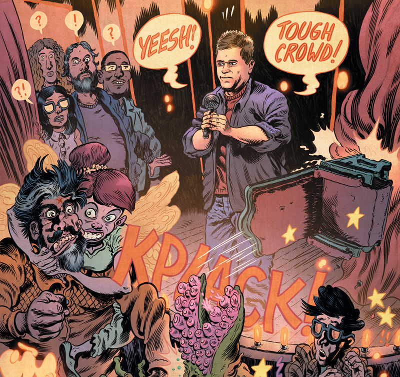 As the project came together, comedians had artists they wanted to work with, but just as often, cartoonists had stand-up friends they wanted to bring onto the series. We have all-time funny cartoonists like Evan Dorkin (Milk and Cheese) and Troy Nixey (Vinegar Teeth), versatile master draftsmen who move in the comedy world like Robert Hack (Chilling Adventures of Sabrina), world-class caricaturists like Richard P. Clark (HBO), and the vanguard of the next generation of funny comickers, online and off, like Sarah Burrini (Nerd Girl) and Tania Del Rio (Marvel: What Now?!).