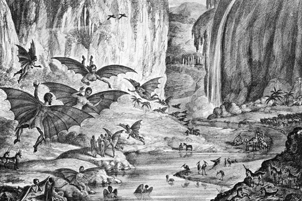 The co-publisher and printer of Brother Jonathan, Benjamin Henry Day, has a fascinating place in America's pop culture history himself. Day was a staunch advocate of producing cheap publications for the masses throughout his career, and before Brother Jonathan, started the first penny paper,which was also the first major "sensational" newspaper in the country, the New York Sun. You'll often see the Sun referred to as a tabloid, but I'm trying hard to avoid that here because the term tabloid also implies size and format. The Sun was not of that familiar format, but it certainly was sensational. It is perhaps best remembered today for publishing "The Great Moon Hoax", which was a widely-believed bit of fake news about the discovery of Batmen on the moon. The tale of these Batmen — they're really more like Man-Bats, I suppose — is itself a noteworthy footnote in comic book history, because a century later, future Batman editor and Man-Bat co-creator Julius Schwartz wrote a fanzine article about Benjamin Day's hoax, well in advance of his association with DC Comics.