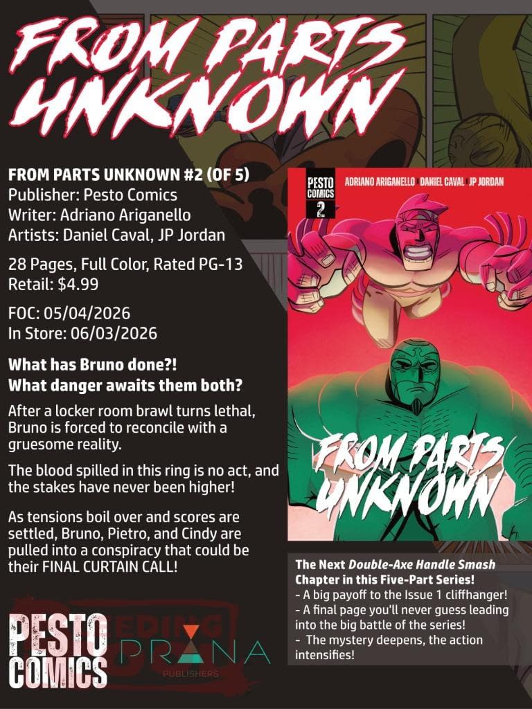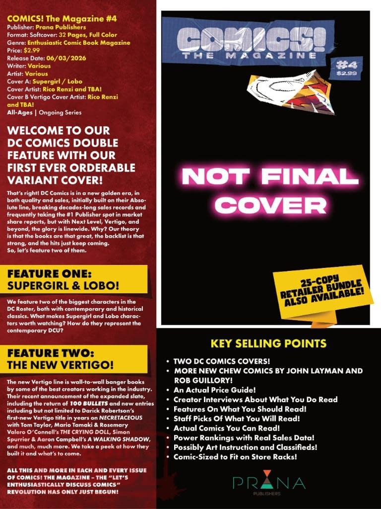 Comics! The Magazine #4 from Prana Publishers, orf Prana Direct Marketing, has a double cover for its fourth issue, focusing on the new DC Comics revival, one with Supergirl/Lobo and another for Vertigo. But they haven't let anyone know what they look like in their June 2026 solicits and solicitations, now with its own sub-distribution section through Lunar Distribution, like Massive Indies and Rocketship. We've run the listings for American Mythology and Source Point Press; here are the ones for Reckah Comics' The Future Is… and Pesto Comics' From Parts Unknown as well.