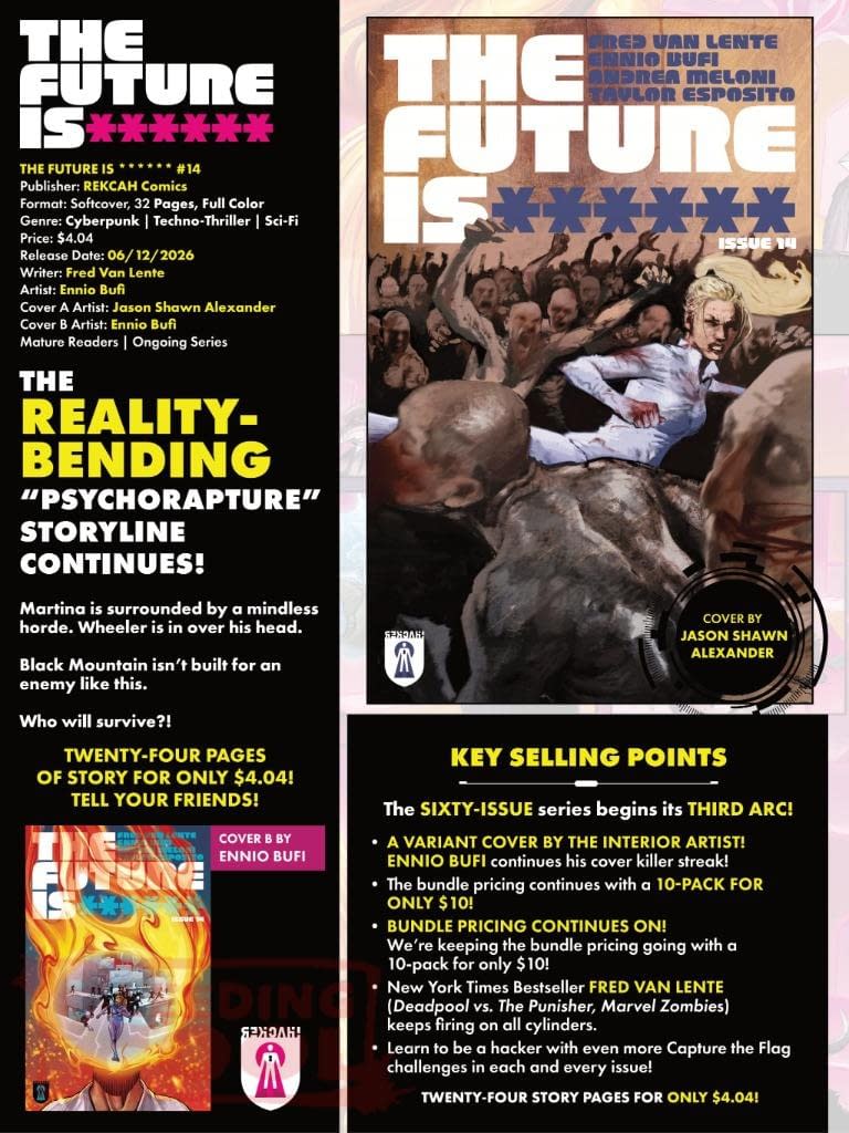 THE REALITY-BENDING "PSYCHORAPTURE" STORYLINE CONTINUES! Martina is surrounded by a mindless horde. Wheeler is in over his head. Black Mountain isn't built for an enemy like this. We'll see who survives! KEY SELLING POINTS • The SIXTY-ISSUE series continues its THIRD ARC! • New York Times Bestseller FRED VAN LENTE (Deadpool vs. The Punisher, Marvel Zombies) keeps firing on all cylinders! • Learn to be a hacker with even more Capture the Flag challenges in each and every issue! • TWENTY-FOUR PAGES OF STORY FOR ONLY $4.04! RETAILERS – Also Available: Variant COVER B by Ennio Bufi, and a value-priced 10-COPY BUNDLE of the Jason Shawn Alexander Cover!