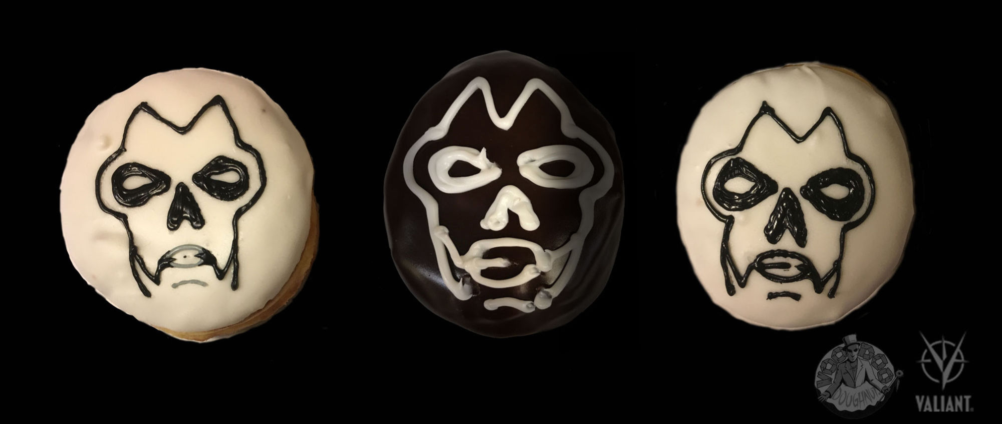 Each of two designs adorned with a hand-piped rendition of the character's mask — chocolate on a vanilla frosted doughnut filled with chocolate Bavarian cream, or vanilla on a chocolate frosted doughnut filled with raspberry jelly — during Valiant's annual ComicsPRO presentation on Friday, February 23rd.
