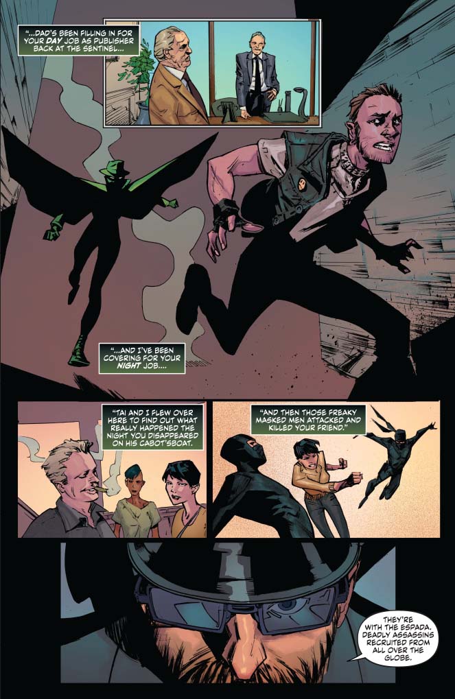 Narrative captions let us get inside the character's head, and I thought it would be useful in particular for Britt to express his feelings here without Mulan knowing. *semi-spoiler* big reveal here if you have been following the ENTIRE Dynamite Green Hornet run… if not, no worries.