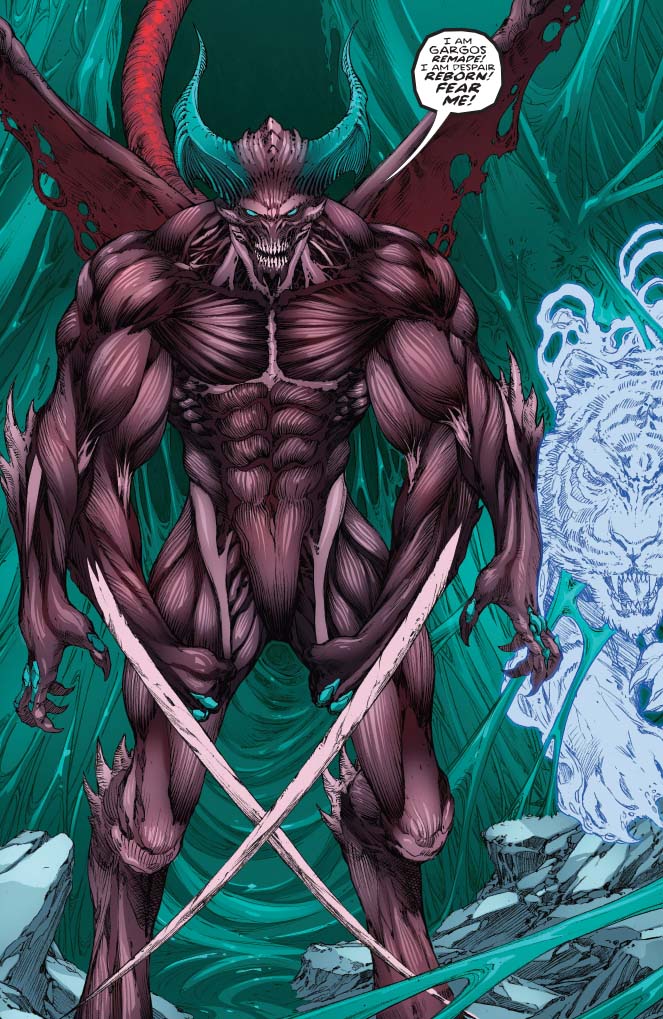 Gargos has returned! The cat's out of the bag and we have the big reveal with this opening, full page splash of the big guy. The games people at Microsoft wanted to beef up his look a little so it was decided to give him an extra set of arms complete with bone blades and taloned feet. The thinking was that since his previous form had been defeated, as he healed and regenerated, he'd build himself a better body. Gargos 2.0!