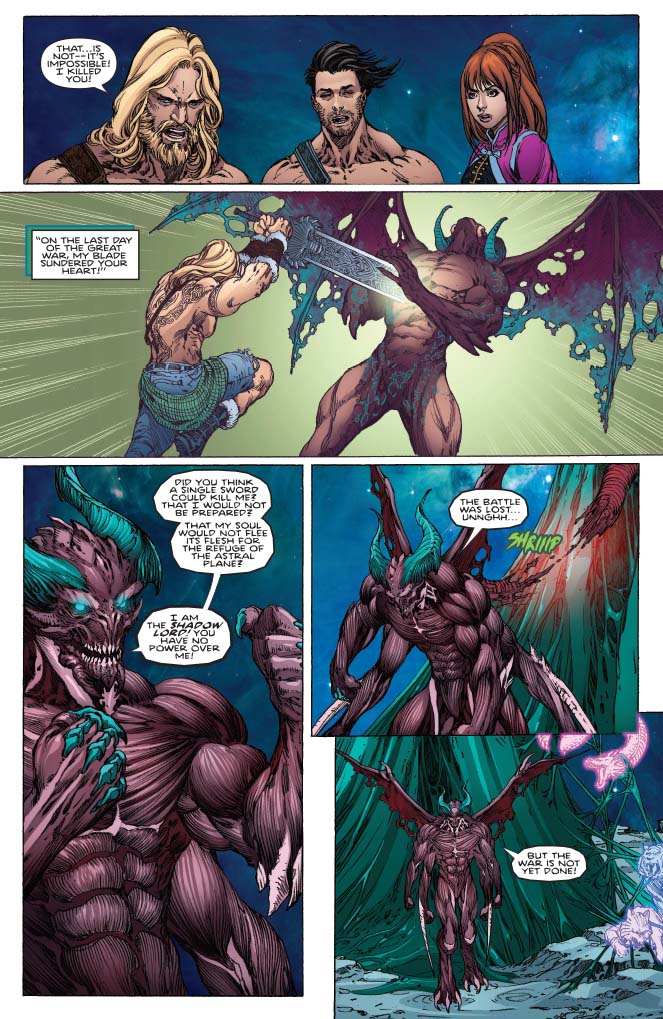 Quite naturally Jago, Tusk and Kim Wu can't quite believe what they're seeing, Tusk especially as he delivered the killing blow to Gargos on the last day of the great war. However, Gargos reveals that he had plans within plans and had prepared for the possibility of his (albeit temporary) defeat. You don't get to be a world dominating S.O.B. without thinking ahead!