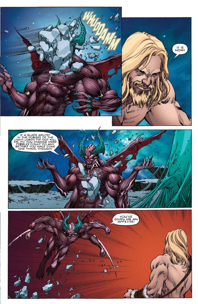 I love this bit. While Gargos is grandstanding, Tusk hits him in the face with a huge great boulder. It doesn't do him any harm, but it does put a dent in his dignity.