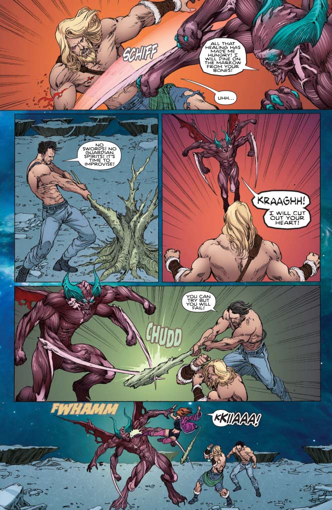 Tusk, Kim Wu and Jago keep harrying Gargos. They attack, fall back then strike again. They know that they're not a match for him in a full-on brawl so they're trying to keep him off-balance instead, hitting him from all directions and not giving him a chance to focus his attacks. It works for a while but eventually Gargos gets the drop on them, or so he thinks.