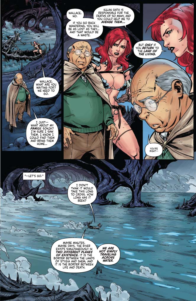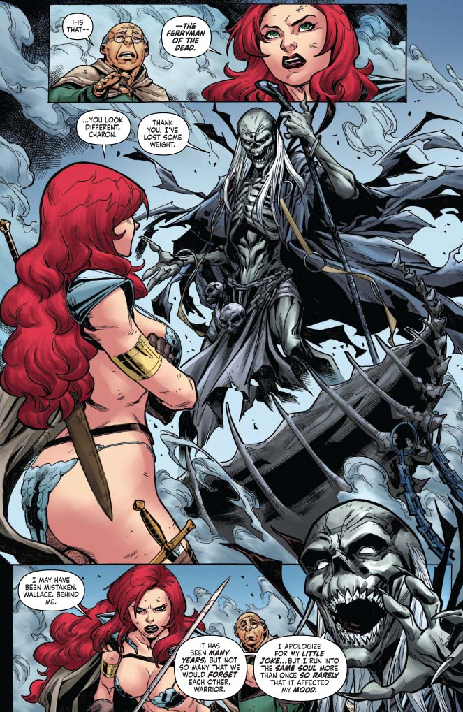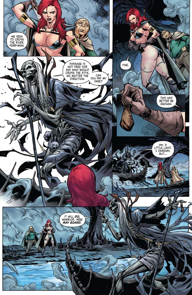 Here we have Sonja and Wallace crossing the River Styx. As Charon is noting, the river exists both as a gateway to the underworld AND as a natural river in Hyborea. The two rivers overlap, and some, like Charon, may cross from one to another.