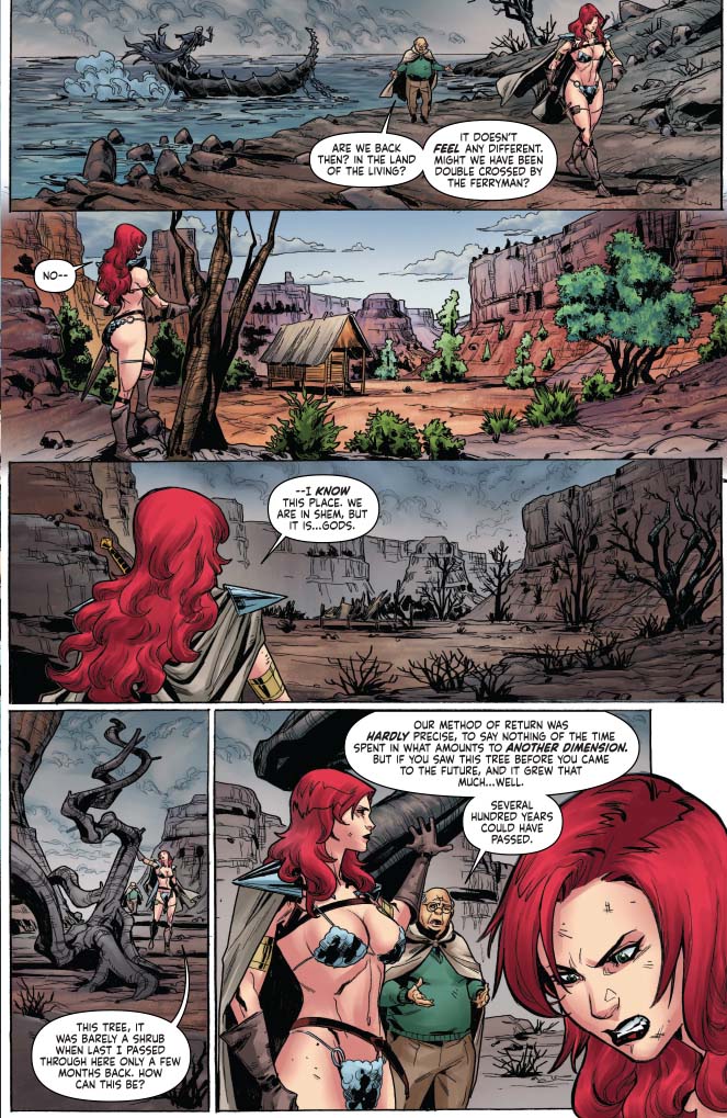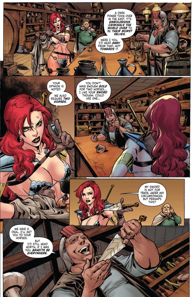 Panel 4 is my favorite here — Sonja's eye rolling is perfect.
