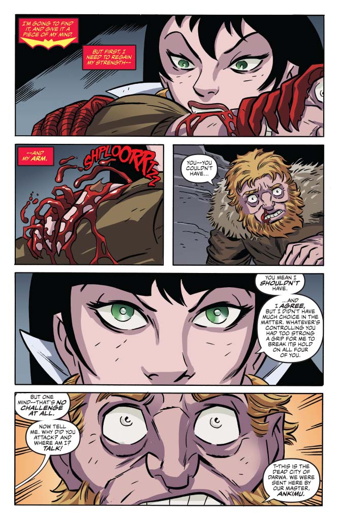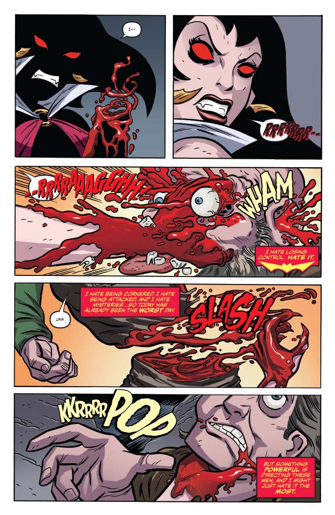 A nice little battle with a snake man. The image of Vampi palming a severed head like a basketball on page 19 really makes me chuckle.
