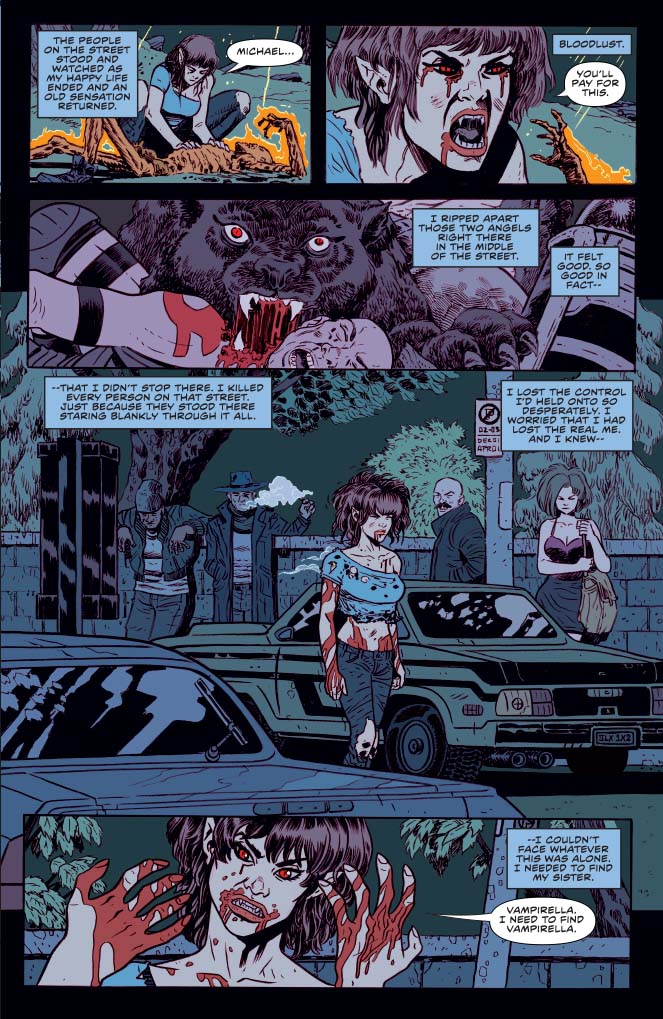 Bottom of page narration is back! It didn't make sense to me to do it when Vampirella wasn't part of the scene, so we held it back until we got back to the present. Now we're back and Vampirella is getting both physically and narratively kicked in the teeth.