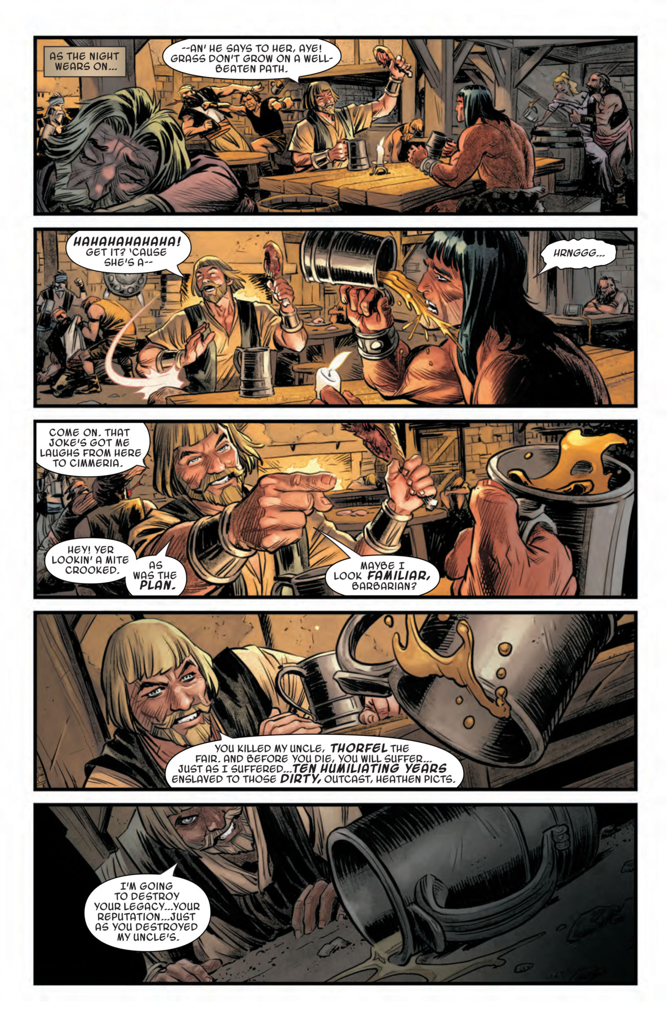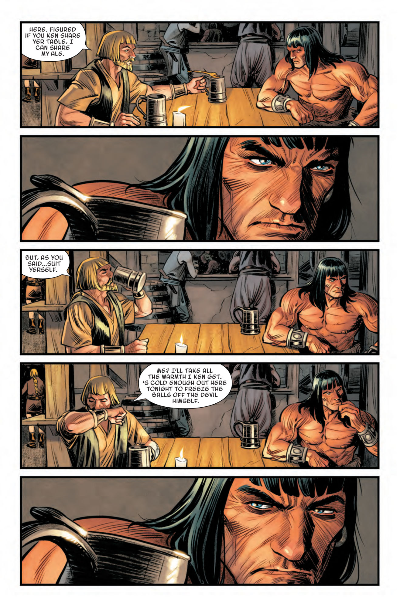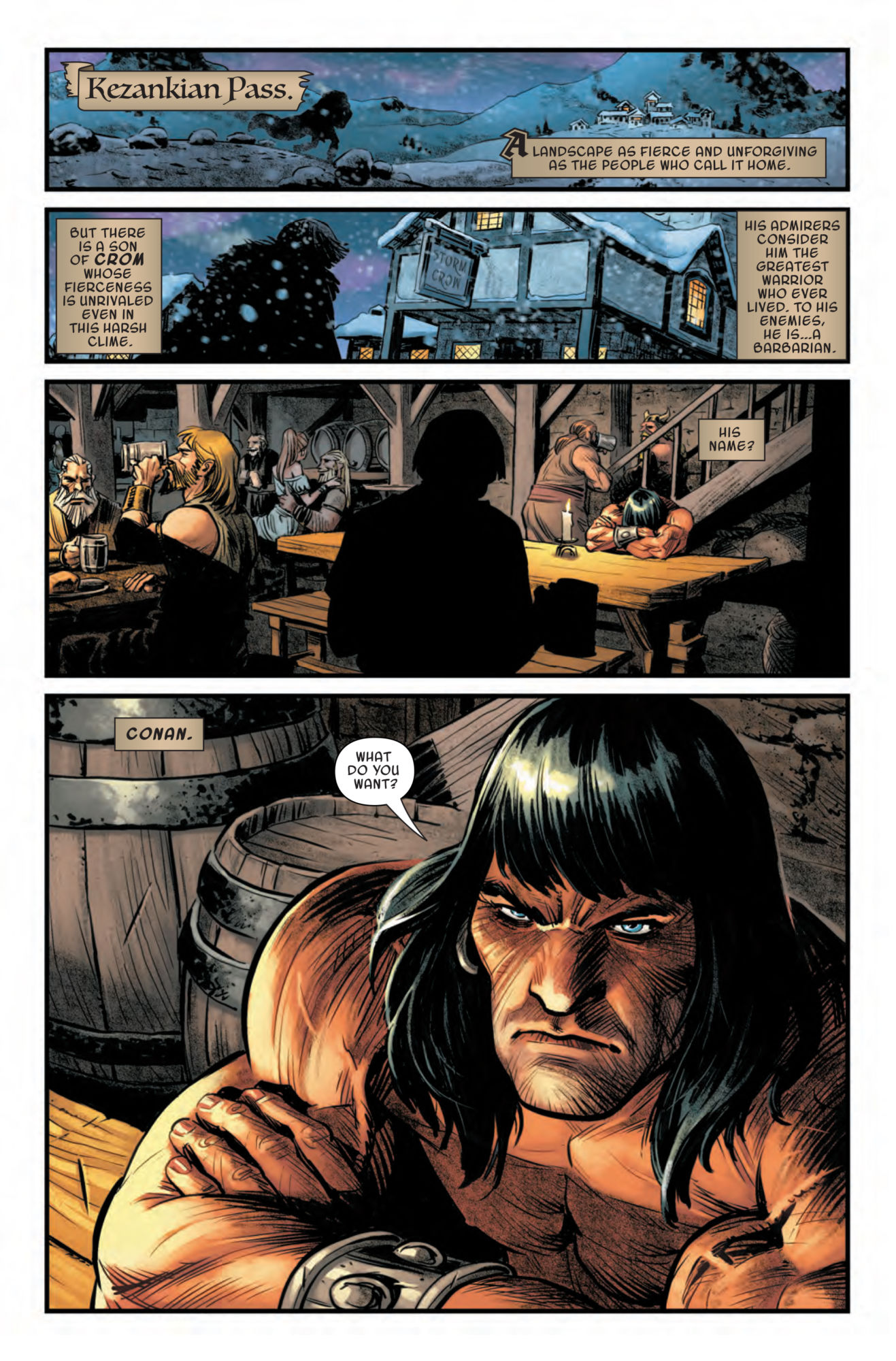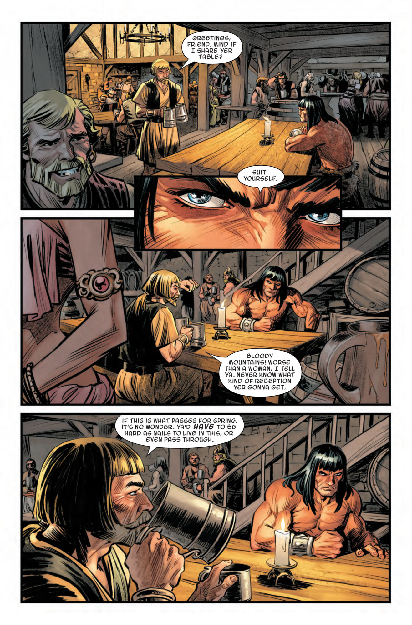 It starts when a stranger approaches Conan in a tavern, asking to share his table.
