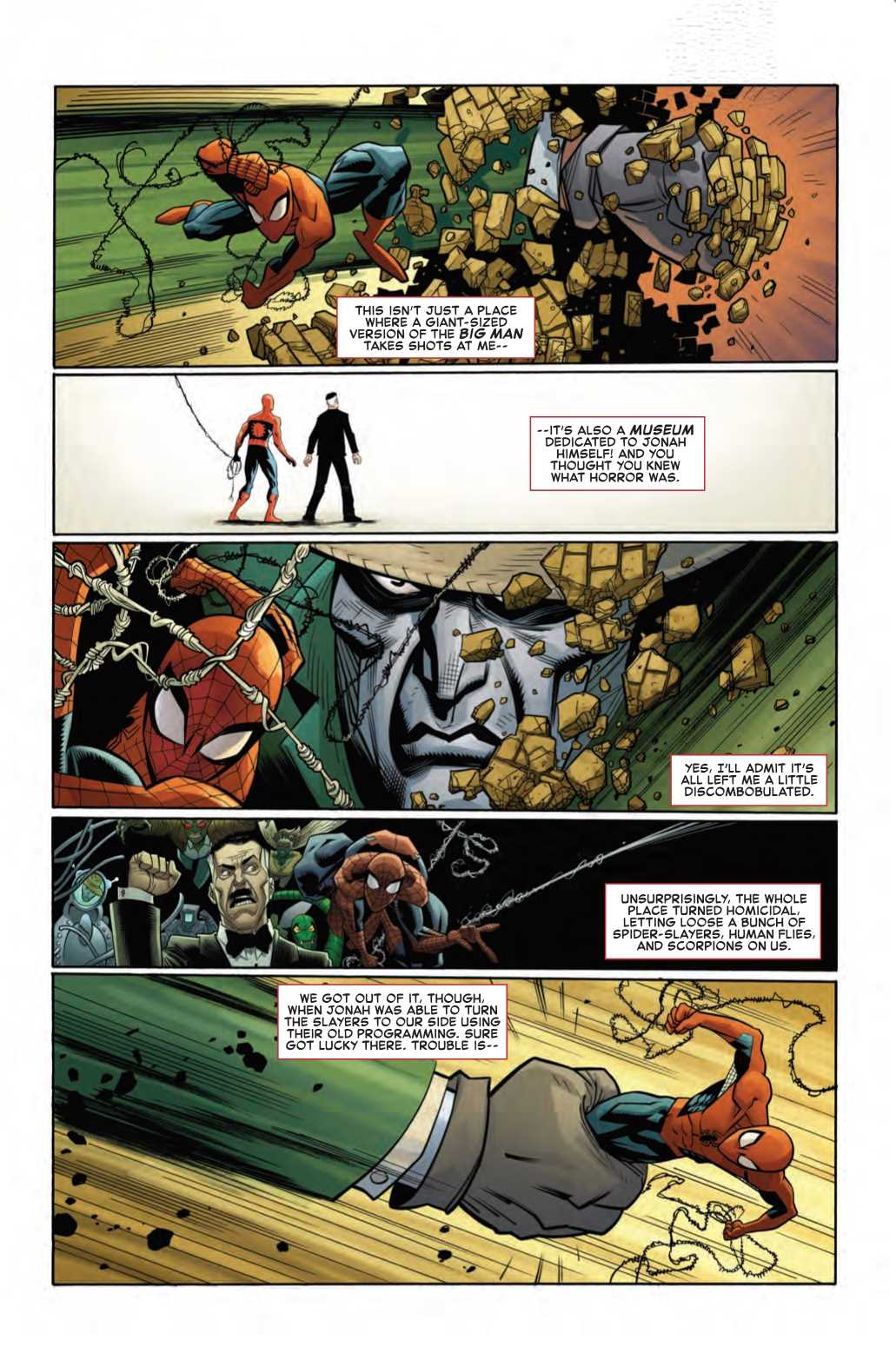 The latest storyline from Amazing Spider-Man demonstrates the dangers of continuity better than most, as the titular wall-crawler and his pal J. Jonah Jameson have been trapped in a labyrinth of J. Jonah's past, and it's trying to kill them. Even so, Spider-Man can't help but spend the entire preview below recapping past events, so obsessed with continuity that he's not even giving his full attention to battling a giant-sized Big Man until it catches up with him…