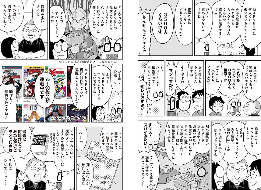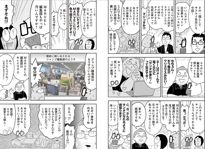 C.B. talks about the characters and themes of Marvel Comics and the excitable editor and his staff get even more excited and CB agrees to a collaboration between Marvel and Shonen Jump Plus.