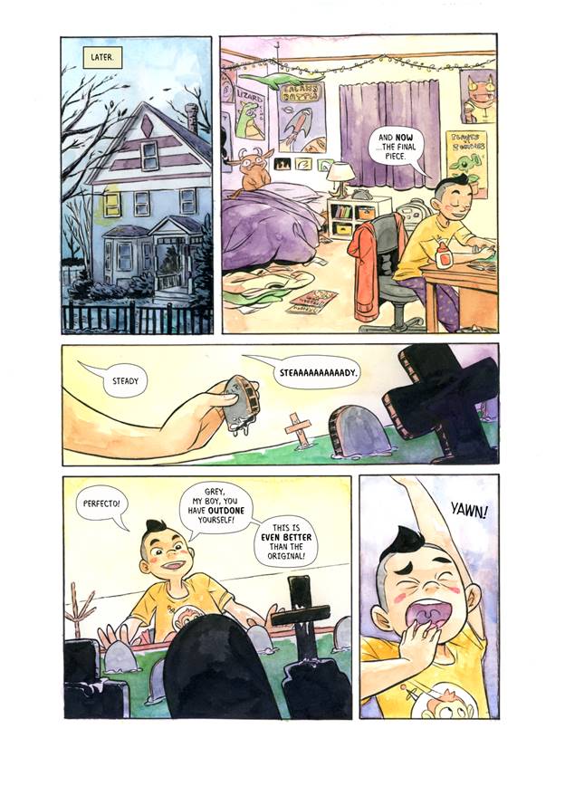 THE GHOUL NEXT DOOR is about an 11-year-old boy named Grey Brighton who befriends a ghoul named Lavinia after she helps him with his history project: a map of the cemetery. Lavinia brings him presents that are considerate by ghoul standards (and gruesome by human standards) but when she brings him home to meet the family, Grey is given a choice: become a ghoul himself by eating the dead, or death. Lavinia helps her friend escape only to put them on a collision course with the spirit of a vengeful witch, who holds Lavinia captive unless Grey helps Lavinia still the witch's mortal remains (which the ghouls have been unwittingly snacking on). Can Grey find the courage to face death in the land of the ghouls to save his friend's life?