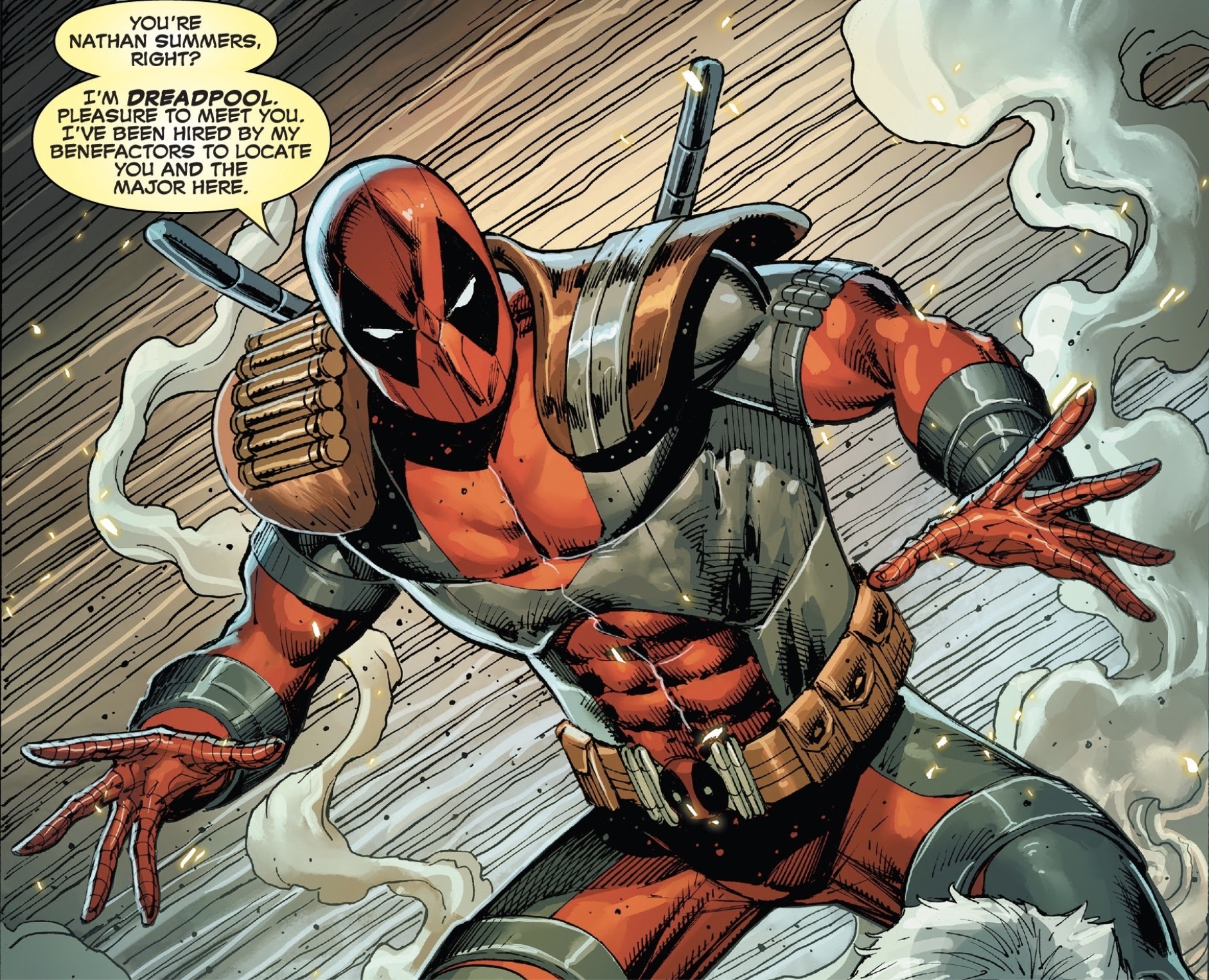 GoodNight, the grown-up version of the young boy whose parents Deadpool murdered in a Batman origin homage has captured Deadpool, removed his bones from his body, and intends to kill him for revenge, but not before recapping his entire origin story. After Deadpool murdered his parents, a mysterious person in a hoodie offered to help him get revenge if GoodNight would follow his instructions, which GoodNight does. That starts with taking credit for his parent's murder and being sent to Juvenile Detention, which hardens him up. That was just the beginning though, because hoodie guy shows up when GoodNight is released at age 18 and teleports him to various places and times in history, each helping GoodNight train for his eventual battle with Deadpool.