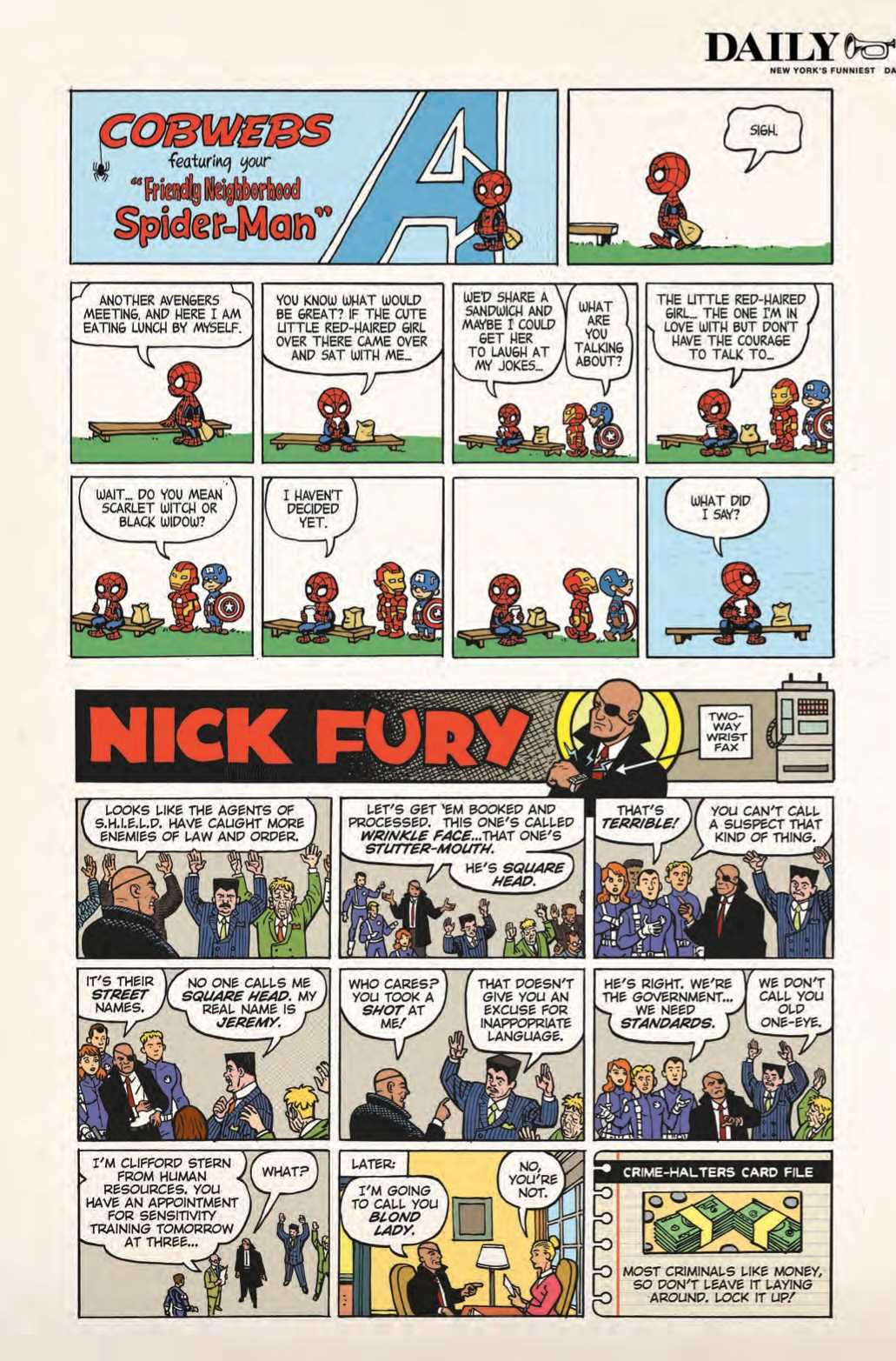 Marvel Superhero Adventures Spider-Man Web of Intrigue #1 isn't just the comic with the longest title on stands next week. It also brings a bonus touch of nostalgia in the form of The Daily Bugle's Sunday Comics page, featuring some tributes to classic comic strips from yesteryear, like a Gary Larson Far Side homage called the Strange Side, a Peanuts homage starring Spider-Man, Nick Fury as Dick Tracy, and "It Better Not Get Worse." Check out the funny pages below: