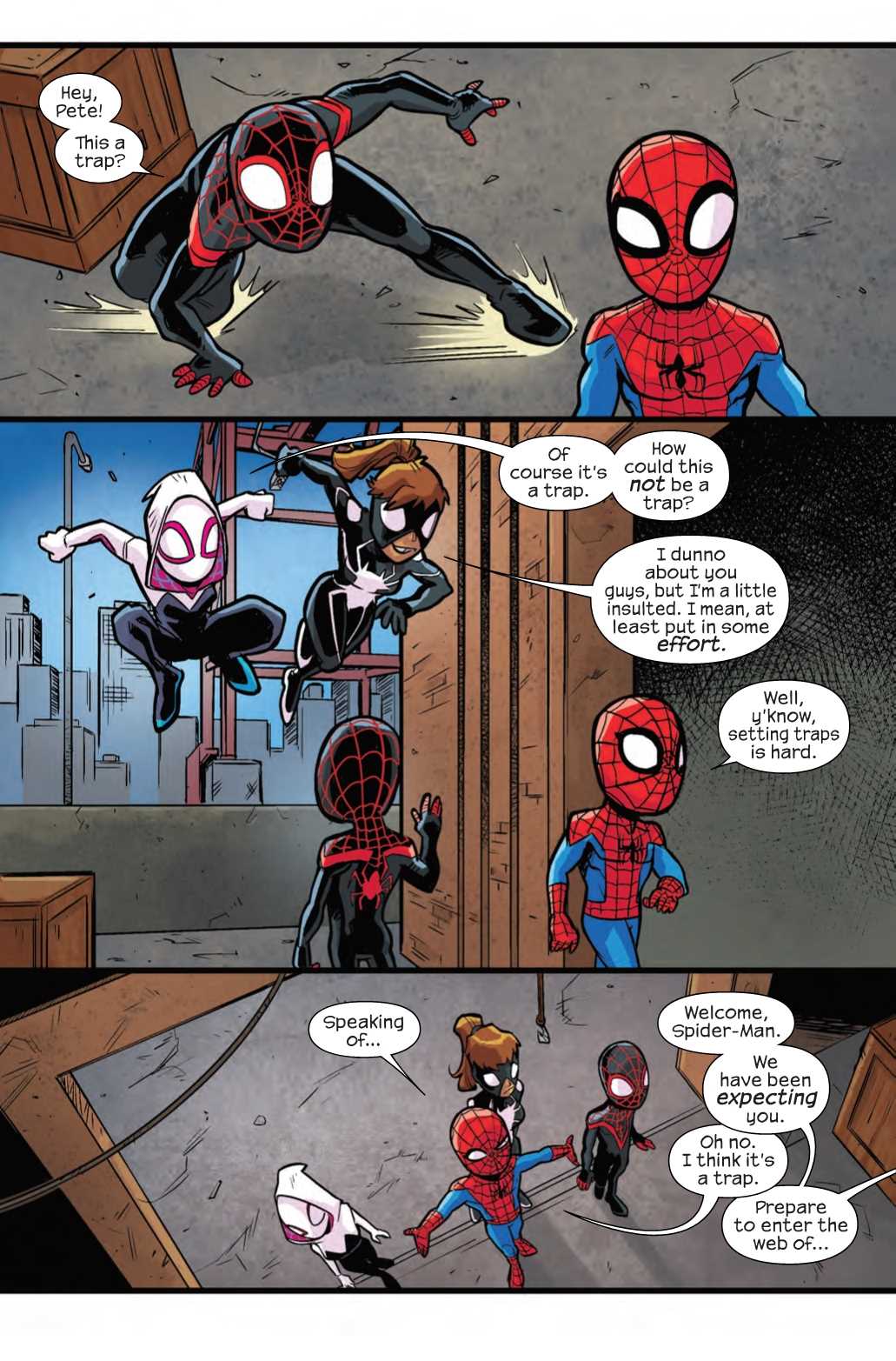• So, what happens when your friendly neighborhood Spider-Man meets up with his favorite Spider-Pals, Miles, Gwen and Anya?