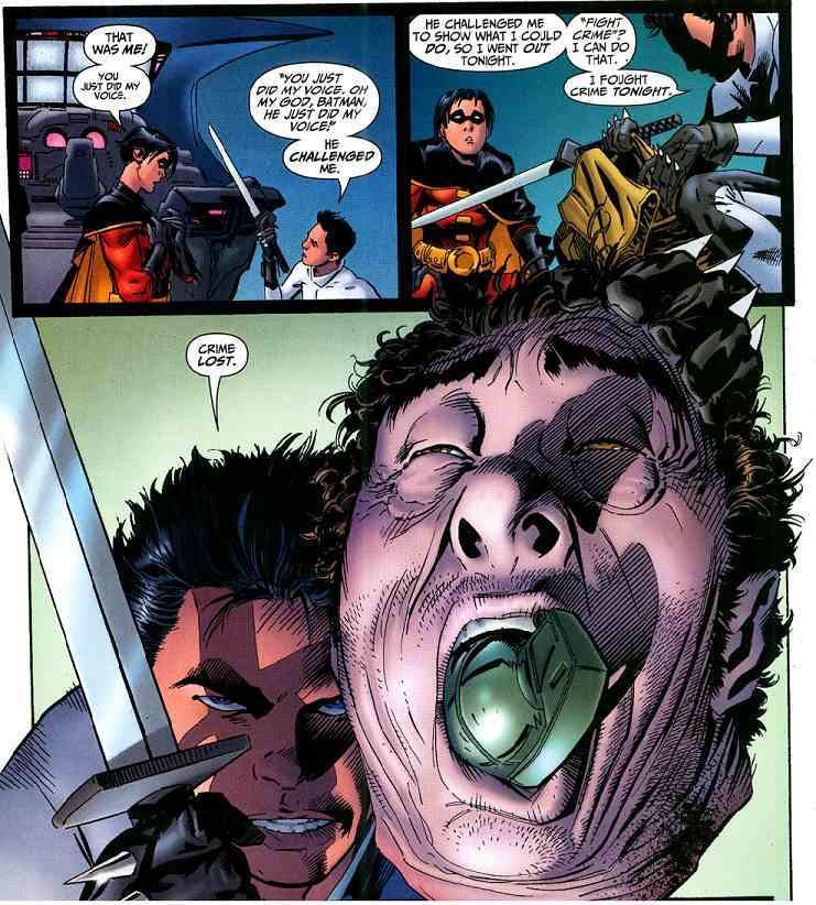 He also killed Morgan Ducard who, as Nobody, was killing members of Batman, Incorporated and tried to turn Damian against Bruce, showing Damian that Batman's no-kill policy was wrong. Damian agreed — and killed Ducard.