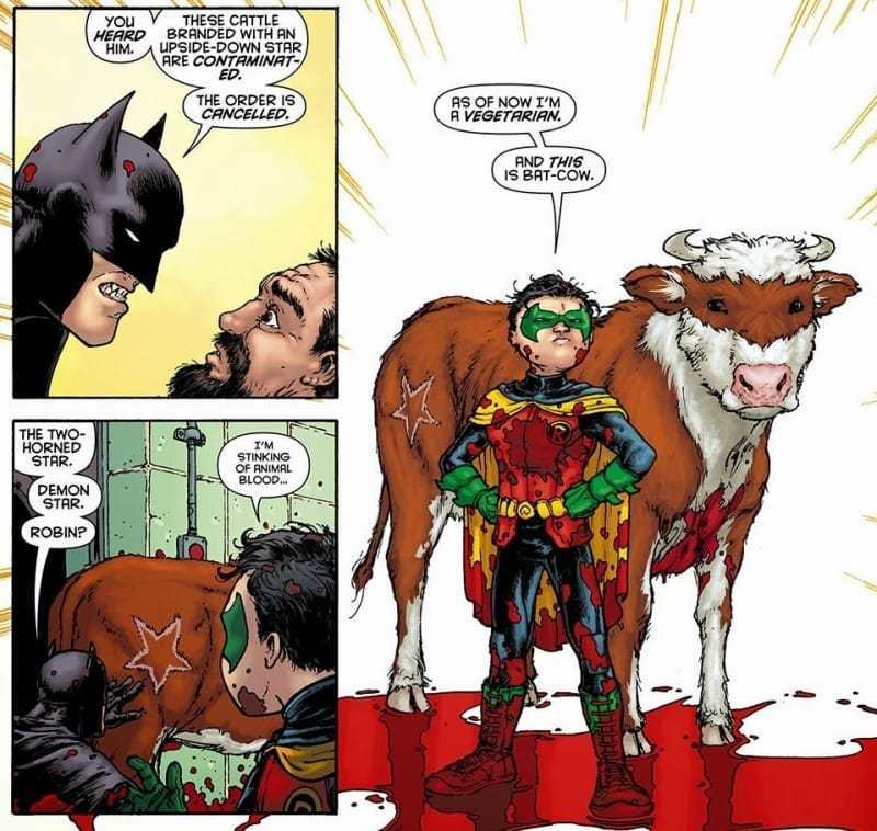 Vegetarian no more? After all his co-creator Grant Morrison, vegetarian who made Animal Man a vegetarian as well, revealed that he was no longer of that lifestylee choice. And in today's Superman comic, as Damian Wayne has to come to terms with a returning Superboy who had lived another seven years in space without him, and has gone from being younger than Damian to being older – and everything else…