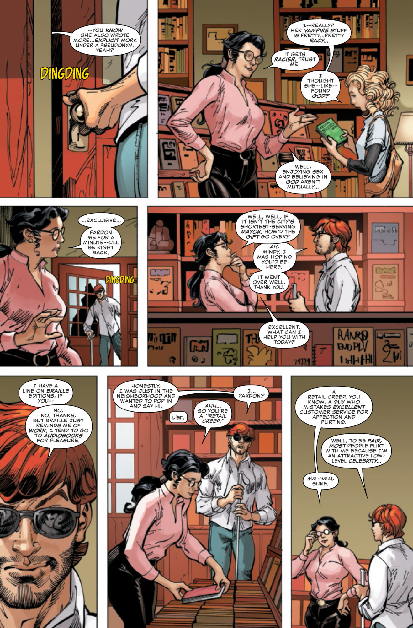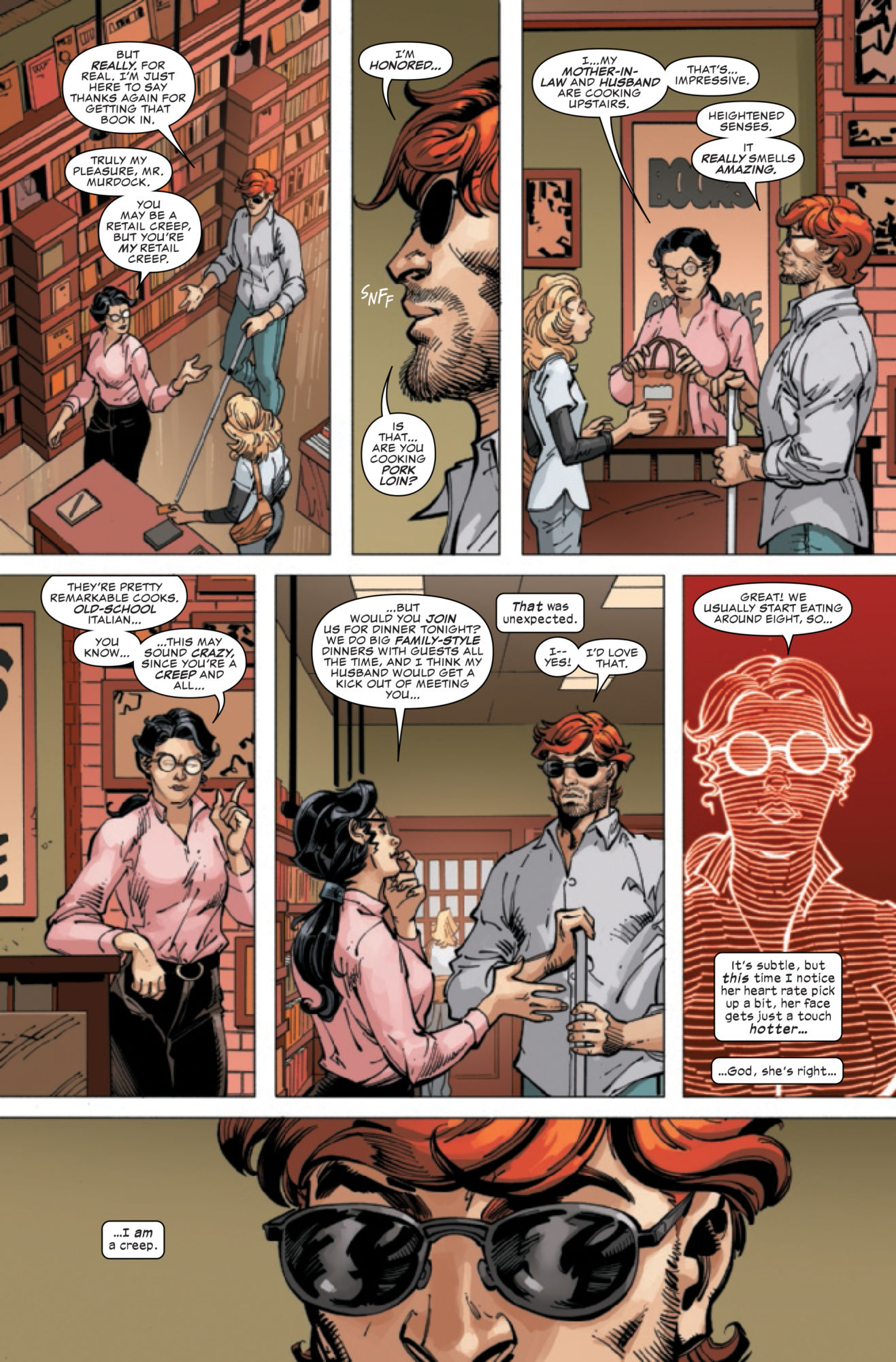 Back in Daredevil #6, we first learned of Daredevil's creepy tendencies as he went out of his way to smell a woman he liked in a bookstore. And from what he could smell, and hear… she wasn't interested. But in Daredevil #8, Matt Murdock returns to that bookstore again. And this time, things go a bit differently.