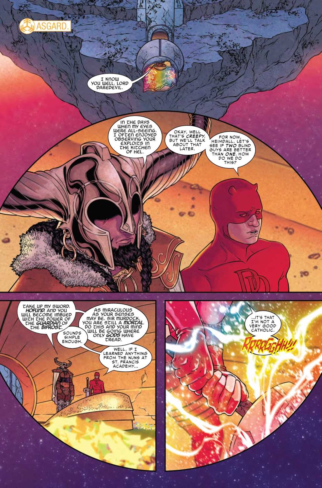 First, we see Daredevil teaming up with Heimdall to restart the Bifrost. Doing so, however, is going to require Daredevil to power up beyond even his current abilities…