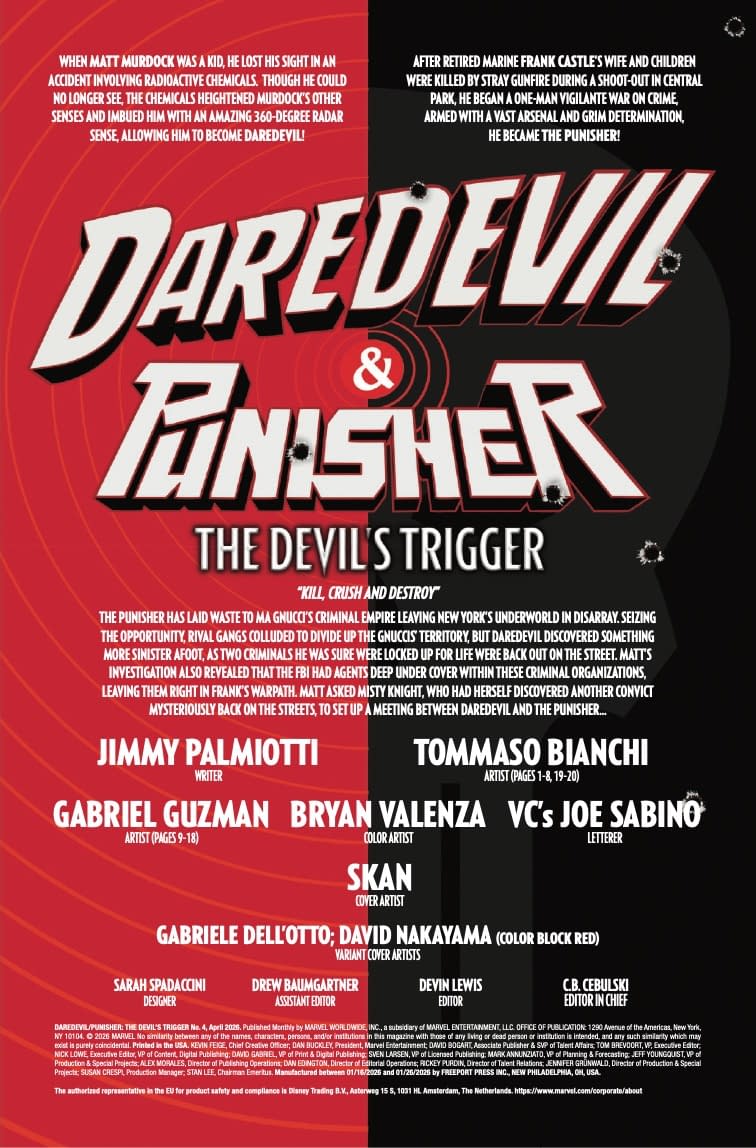 - Cover image for 75960621442600431 DAREDEVIL/PUNISHER: THE DEVIL'S TRIGGER #4 GABRIELE DELL'OTTO VARIANT, by Jimmy Palmiotti & Tommaso Bianchi & Mario Santoro, in stores Wednesday, February 18, 2026 from Marvel