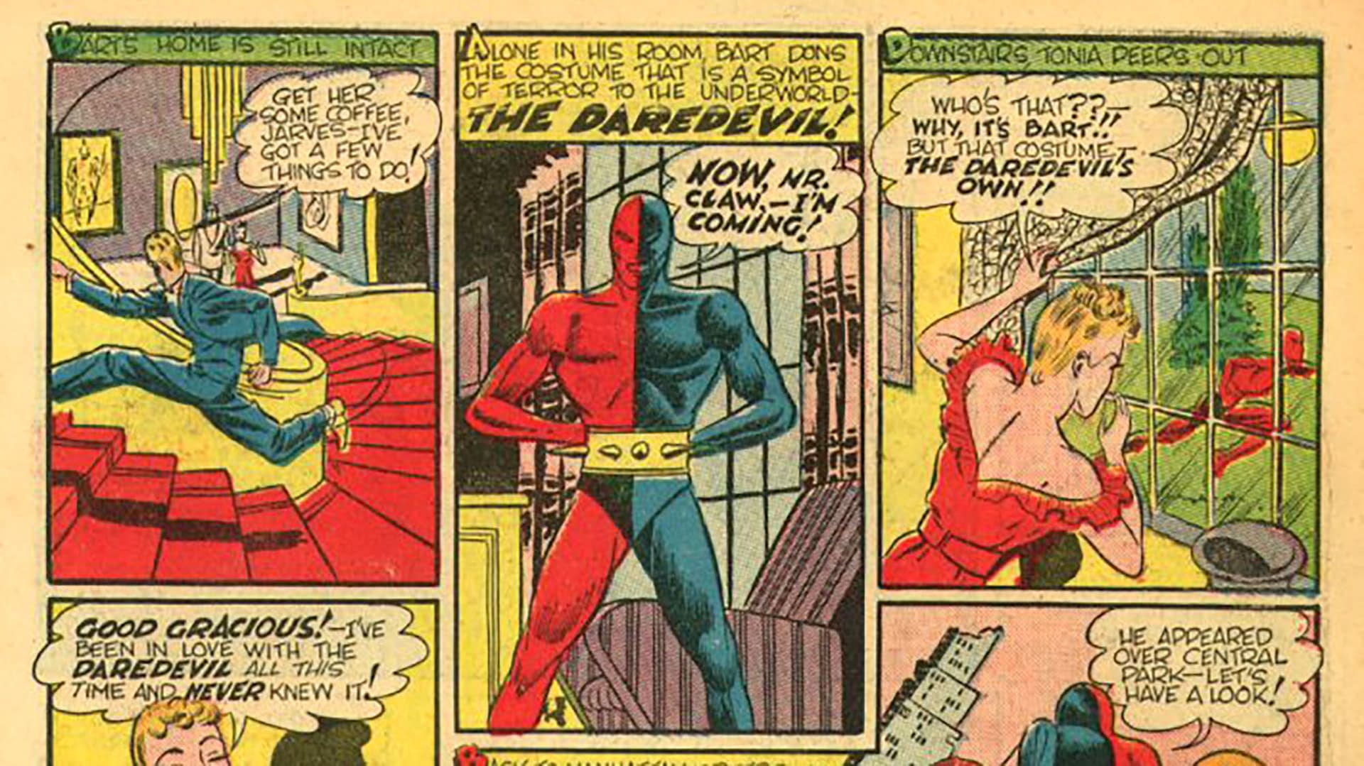 - Jack Cole redesigned Daredevil in red-and-blue for Silver Streak #7, unleashing wildly inventive, chaotic storytelling on the feature.