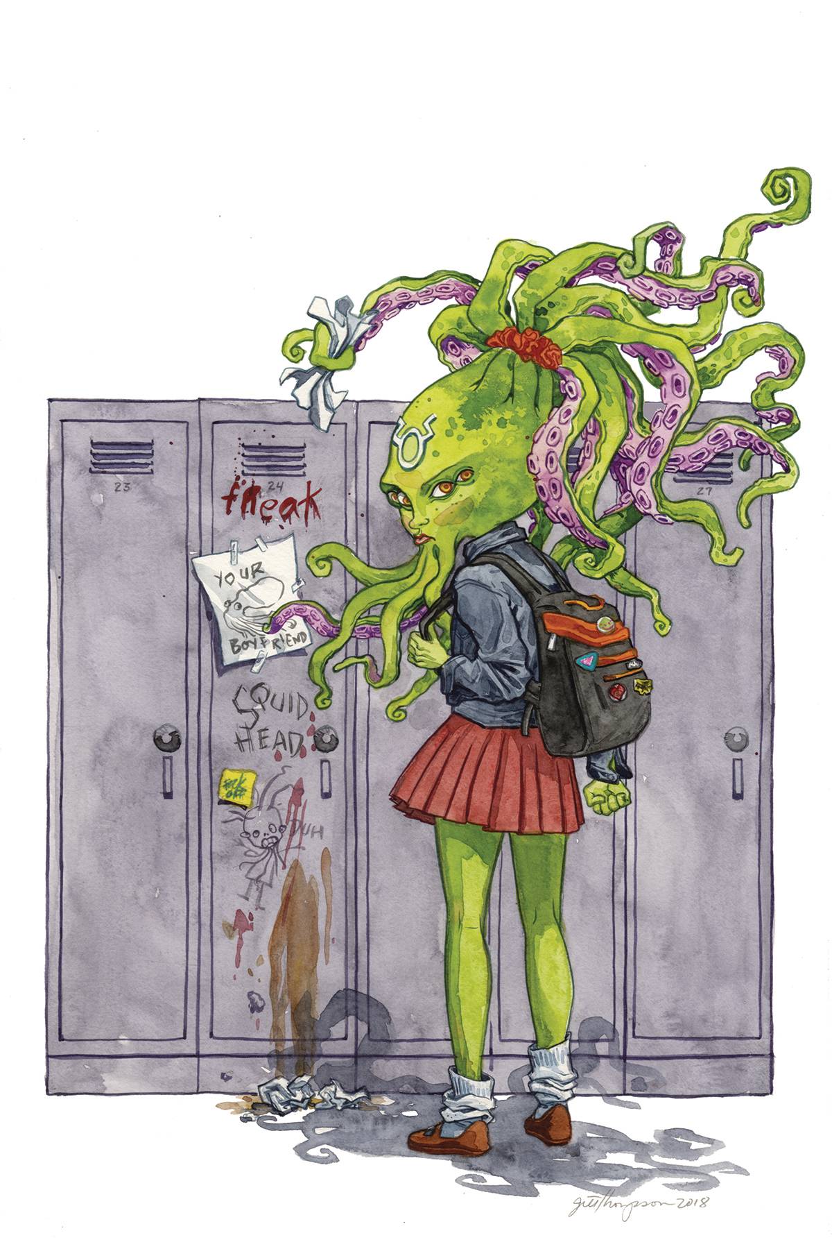 Spawned by the emissary of a Cthulhu god, Cthu-Louise struggles and is teased at school due to her monstrous appearance. Finally fed up with the bullying and abuse, she decides she will do anything to make herself "normal."
