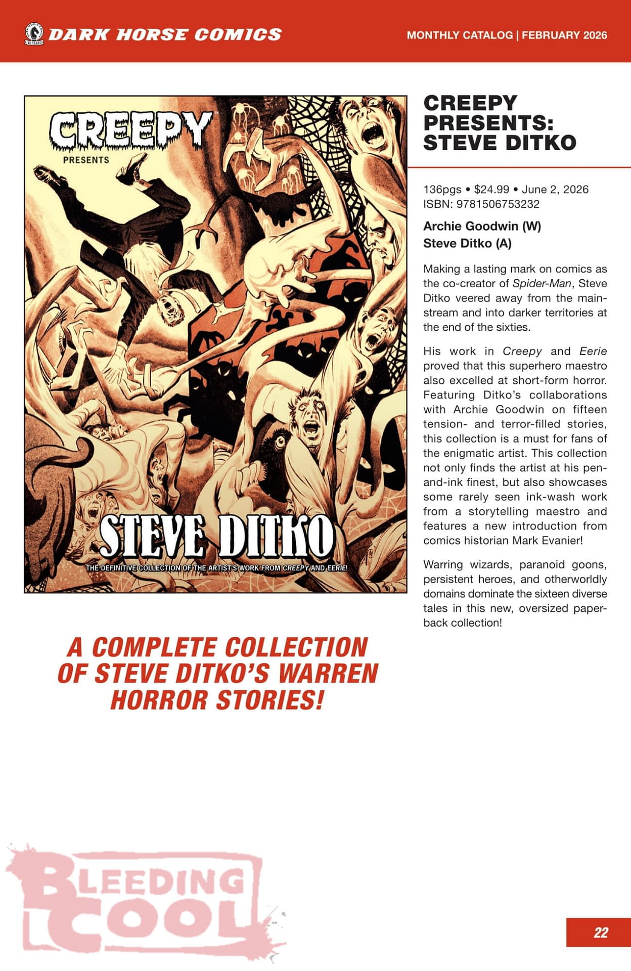 Making a lasting mark on comics as the co-creator of Spider-Man, Steve Ditko veered away from the mainstream and into darker territories at the end of the sixties. His work in Creepy and Eerie proved that this superhero maestro also excelled at short-form horror. Featuring Ditko's collaborations with Archie Goodwin on fifteen tension- and terror-filled stories, this collection is a must for fans of the enigmatic artist. This collection not only finds the artist at his pen-and-ink finest, but also showcases some rarely seen ink-wash work from a storytelling maestro and features a new introduction from comics historian Mark Evanier! Warring wizards, paranoid goons, persistent heroes, and otherworldly domains dominate the sixteen diverse tales in this new, oversized paperback collection! A COMPLETE COLLECTION OF STEVE DITKO'S WARREN HORROR STORIES! 136pgs • $24.99 • June 2, 2026