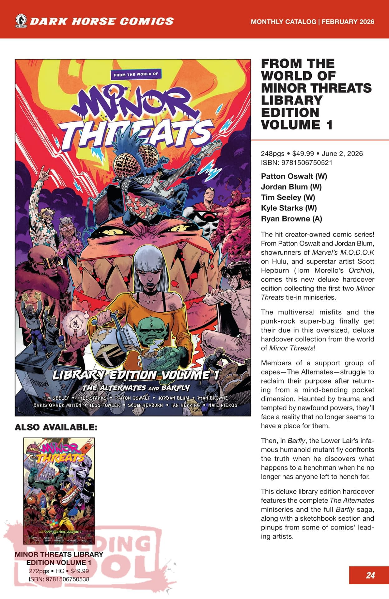 The hit creator-owned comic series! From Patton Oswalt and Jordan Blum, showrunners of Marvel's M.O.D.O.K on Hulu, and superstar artist Scott Hepburn (Tom Morello's Orchid), comes this new deluxe hardcover edition collecting the first two Minor Threats tie-in miniseries. The multiversal misfits and the punk-rock super-bug finally get their due in this oversized, deluxe hardcover collection from the world of Minor Threats! Members of a support group of capes—The Alternates—struggle to reclaim their purpose after returning from a mind-bending pocket dimension. Haunted by trauma and tempted by newfound powers, they'll face a reality that no longer seems to have a place for them. Then, in Barfly, the Lower Lair's infamous humanoid mutant fly confronts the truth when he discovers what happens to a henchman when he no longer has anyone left to hench for. This deluxe library edition hardcover features the complete The Alternates miniseries and the full Barfly saga, along with a sketchbook section and pinups from some of comics' leading artists. 248pgs • $49.99 • June 2, 2026