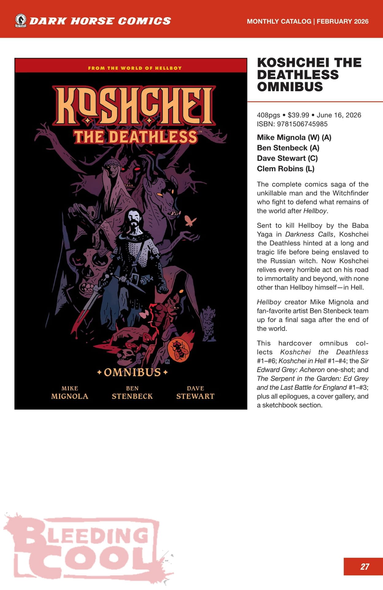 KOSHCHEI THE DEATHLESS OMNIBUS The complete comics saga of the unkillable man and the Witchfinder who fight to defend what remains of the world after Hellboy. Sent to kill Hellboy by the Baba Yaga in Darkness Calls, Koshchei the Deathless hinted at a long and tragic life before being enslaved to the Russian witch. Now Koshchei relives every horrible act on his road to immortality and beyond, with none other than Hellboy himself—in Hell. Hellboy creator Mike Mignola and fan-favorite artist Ben Stenbeck team up for a final saga after the end of the world. This hardcover omnibus collects Koshchei the Deathless #1–#6; Koshchei in Hell #1–#4; the Sir Edward Grey: Acheron one-shot; and The Serpent in the Garden: Ed Grey and the Last Battle for England #1–#3; plus all epilogues, a cover gallery, and a sketchbook section. 408pgs • $39.99 • June 16, 2026