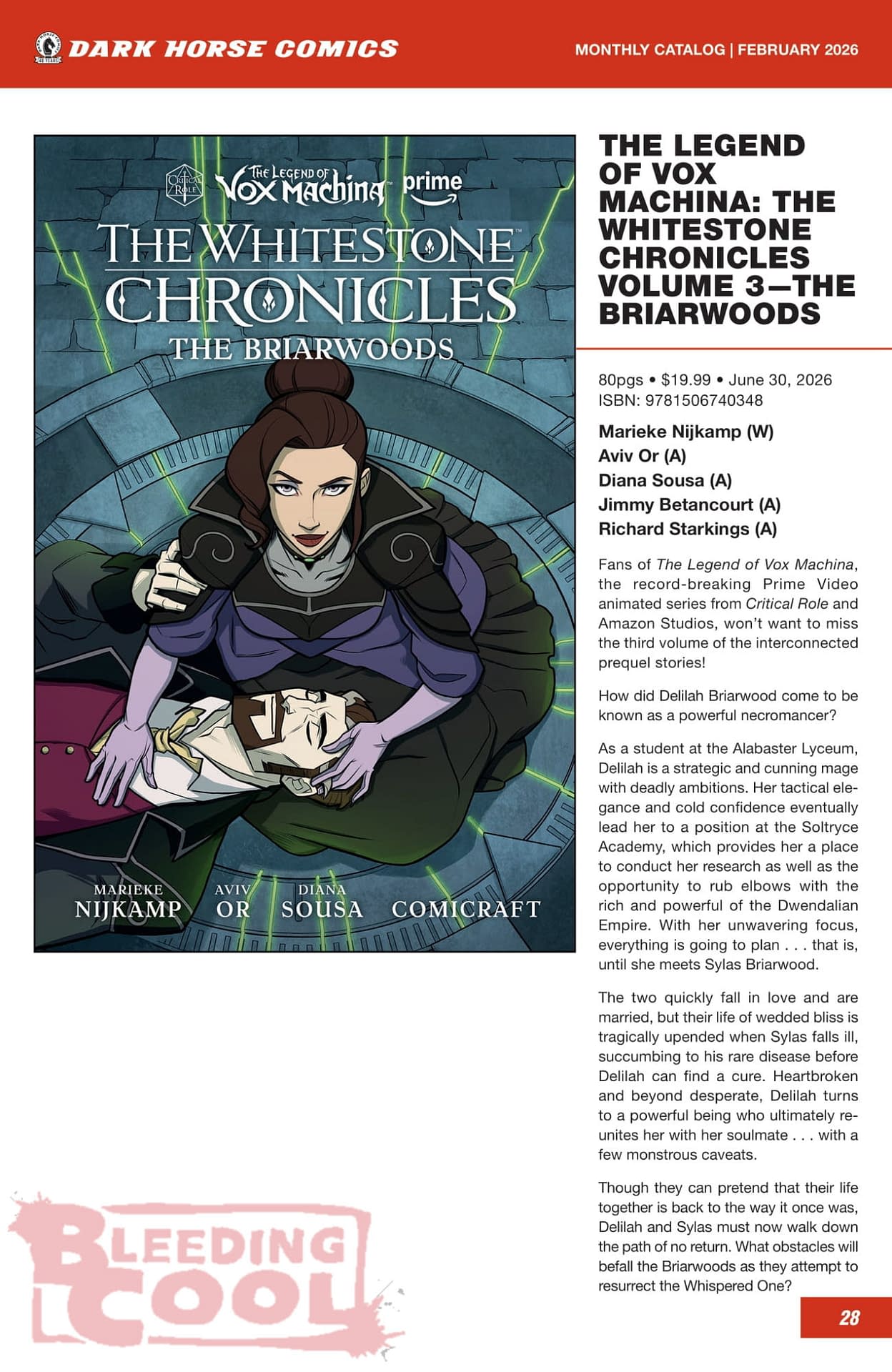 THE LEGEND OF VOX MACHINA: THE WHITESTONE CHRONICLES VOLUME 3—THE BRIARWOODS Fans of The Legend of Vox Machina, the record-breaking Prime Video animated series from Critical Role and Amazon Studios, won't want to miss the third volume of the interconnected prequel stories! How did Delilah Briarwood come to be known as a powerful necromancer? As a student at the Alabaster Lyceum, Delilah is a strategic and cunning mage with deadly ambitions. Her tactical elegance and cold confidence eventually lead her to a position at the Soltryce Academy, which provides her a place to conduct her research as well as the opportunity to rub elbows with the rich and powerful of the Dwendalian Empire. With her unwavering focus, everything is going to plan . . . that is, until she meets Sylas Briarwood. The two quickly fall in love and are married, but their life of wedded bliss is tragically upended when Sylas falls ill, succumbing to his rare disease before Delilah can find a cure. Heartbroken and beyond desperate, Delilah turns to a powerful being who ultimately reunites her with her soulmate . . . with a few monstrous caveats. Though they can pretend that their life together is back to the way it once was, Delilah and Sylas must now walk down the path of no return. What obstacles will befall the Briarwoods as they attempt to resurrect the Whispered One? 80pgs • $19.99 • June 30, 2026